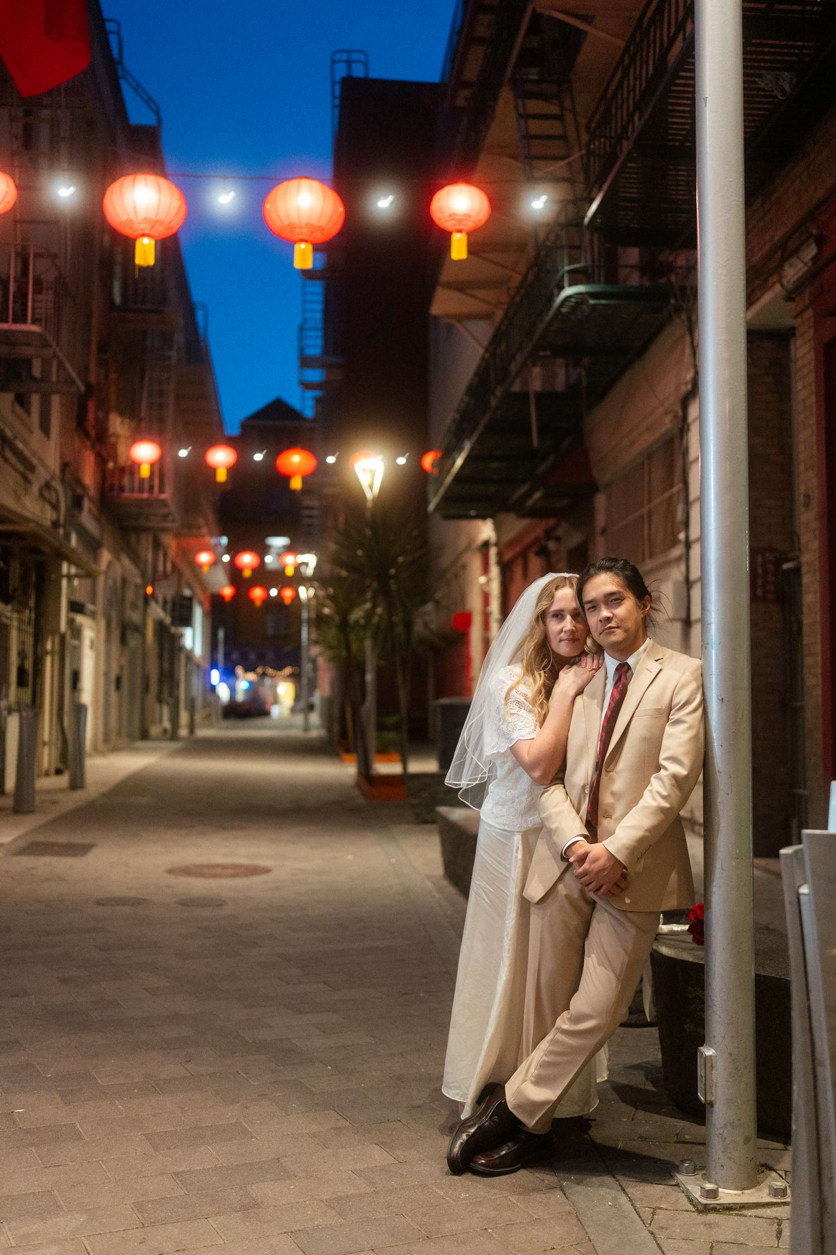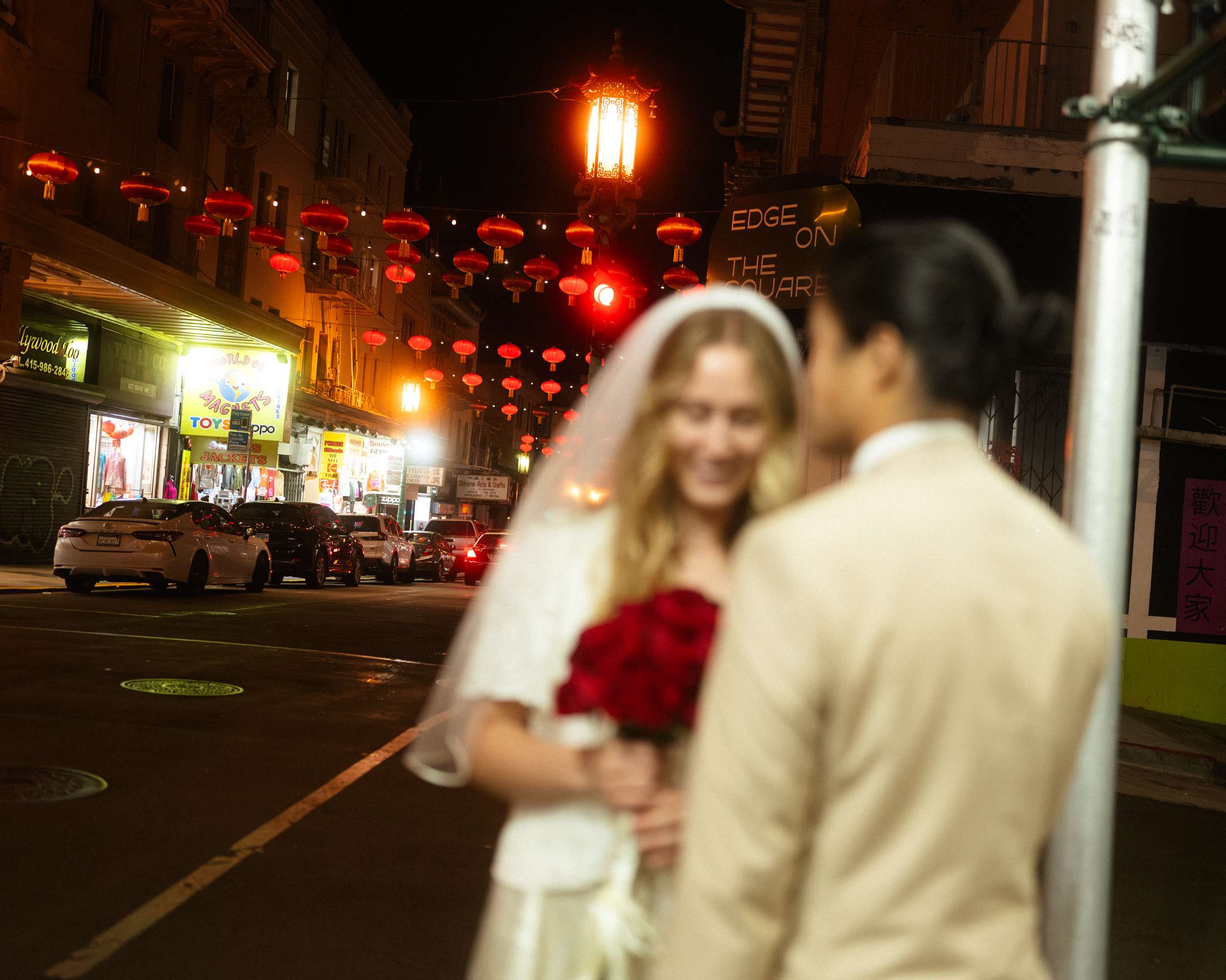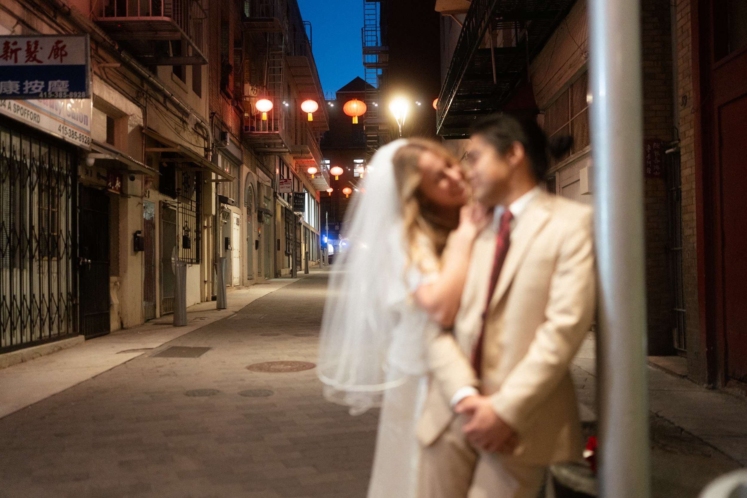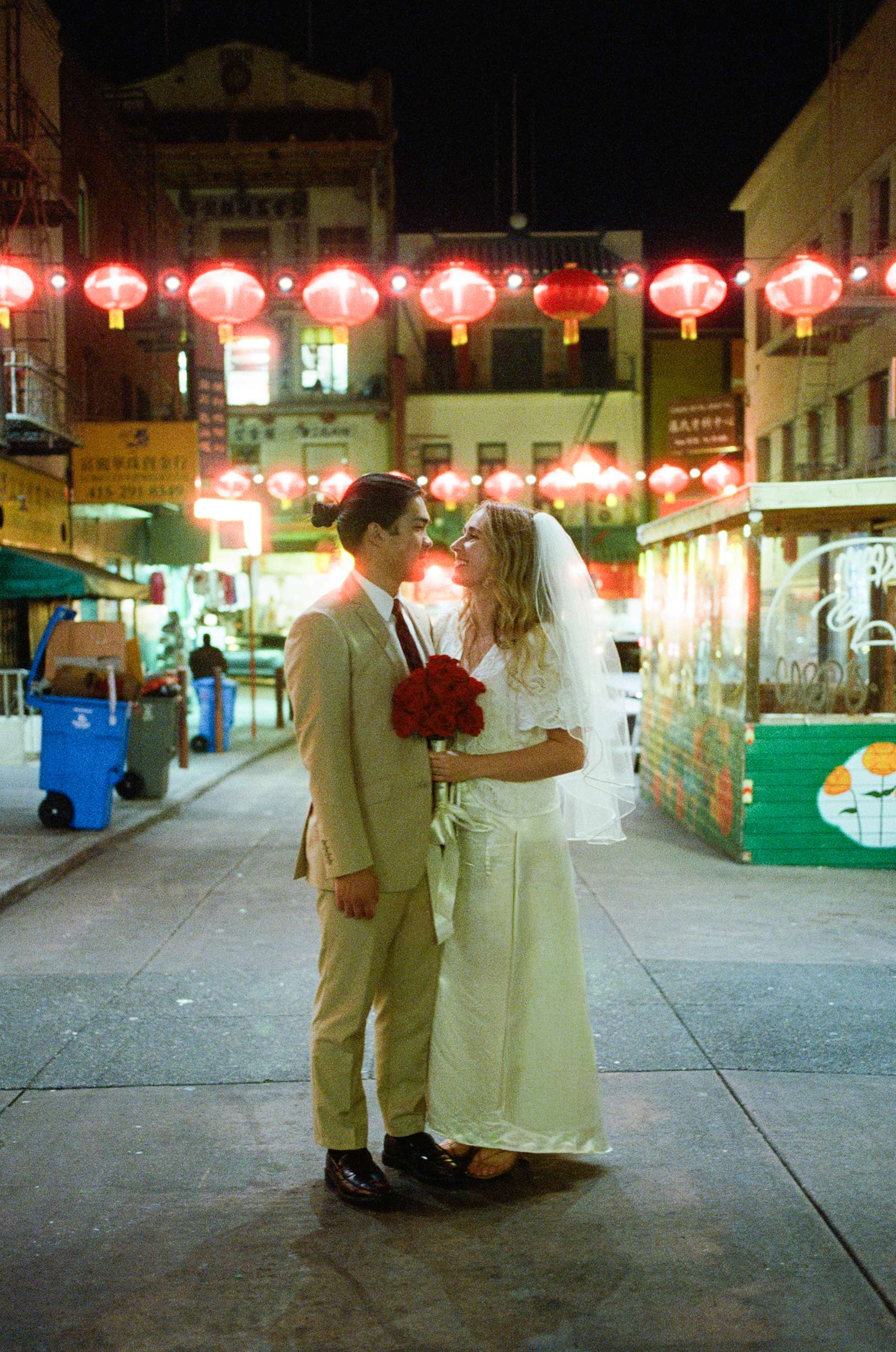 Sam and Kaylee wanted to honour both their backgrounds with a pre-wedding photo session. As a nod to Sam’s Hong Kong heritage (in a distinctly Asian-American way), the two chose to run around San Francisco Chinatown at night. They visited several beloved locally-owned Chinese-American businesses and Chinatown landmarks. Kaylee brought her own piece of family history to the session, wearing her grandmother’s wedding dress and her mother’s veil as a tribute to the women who came before her.