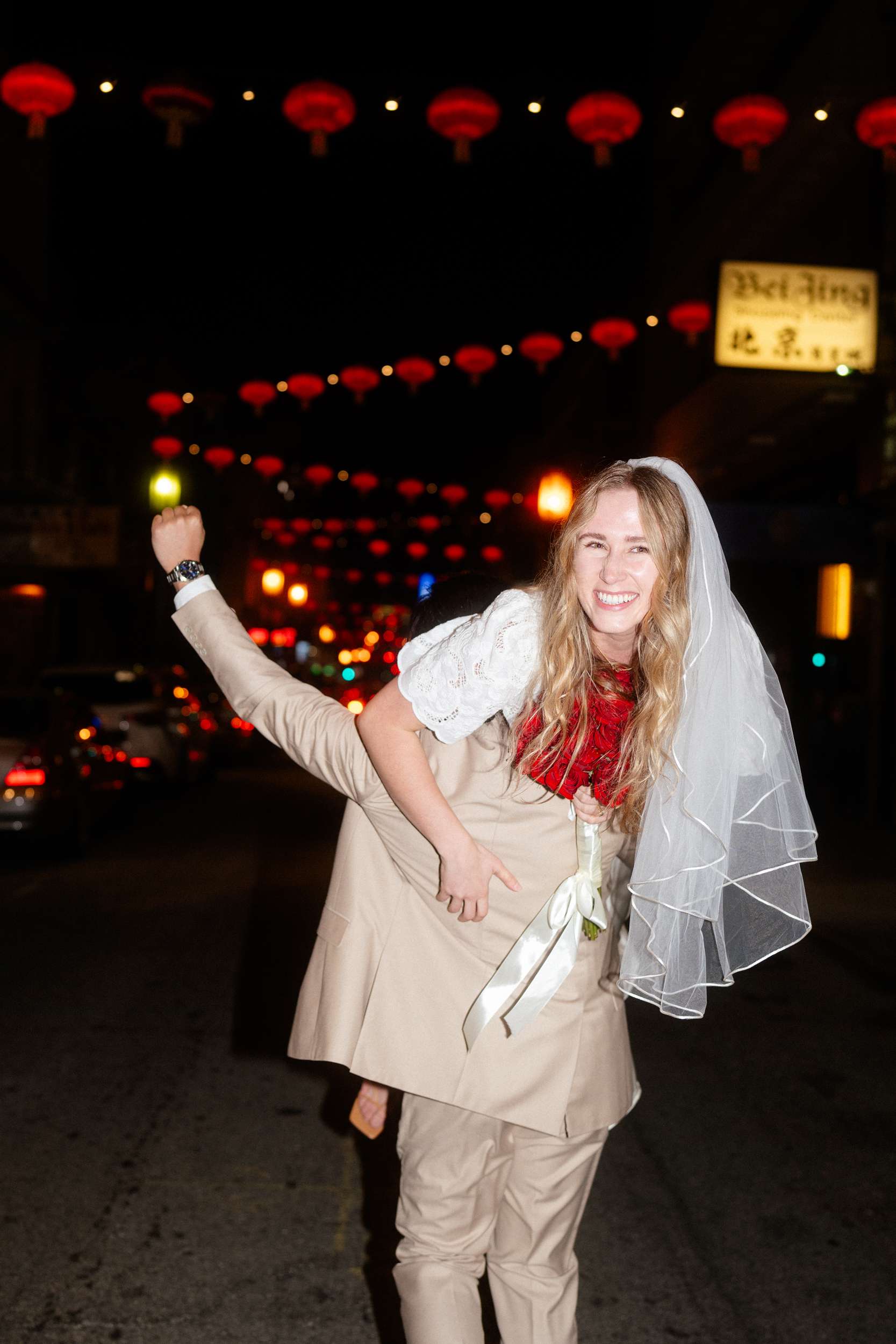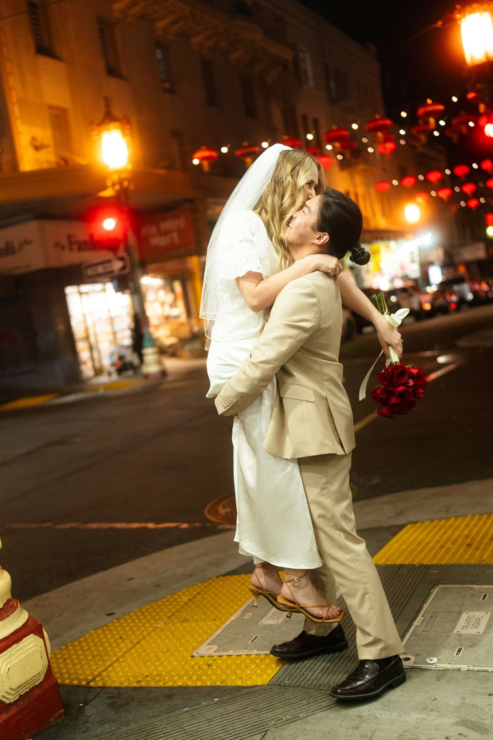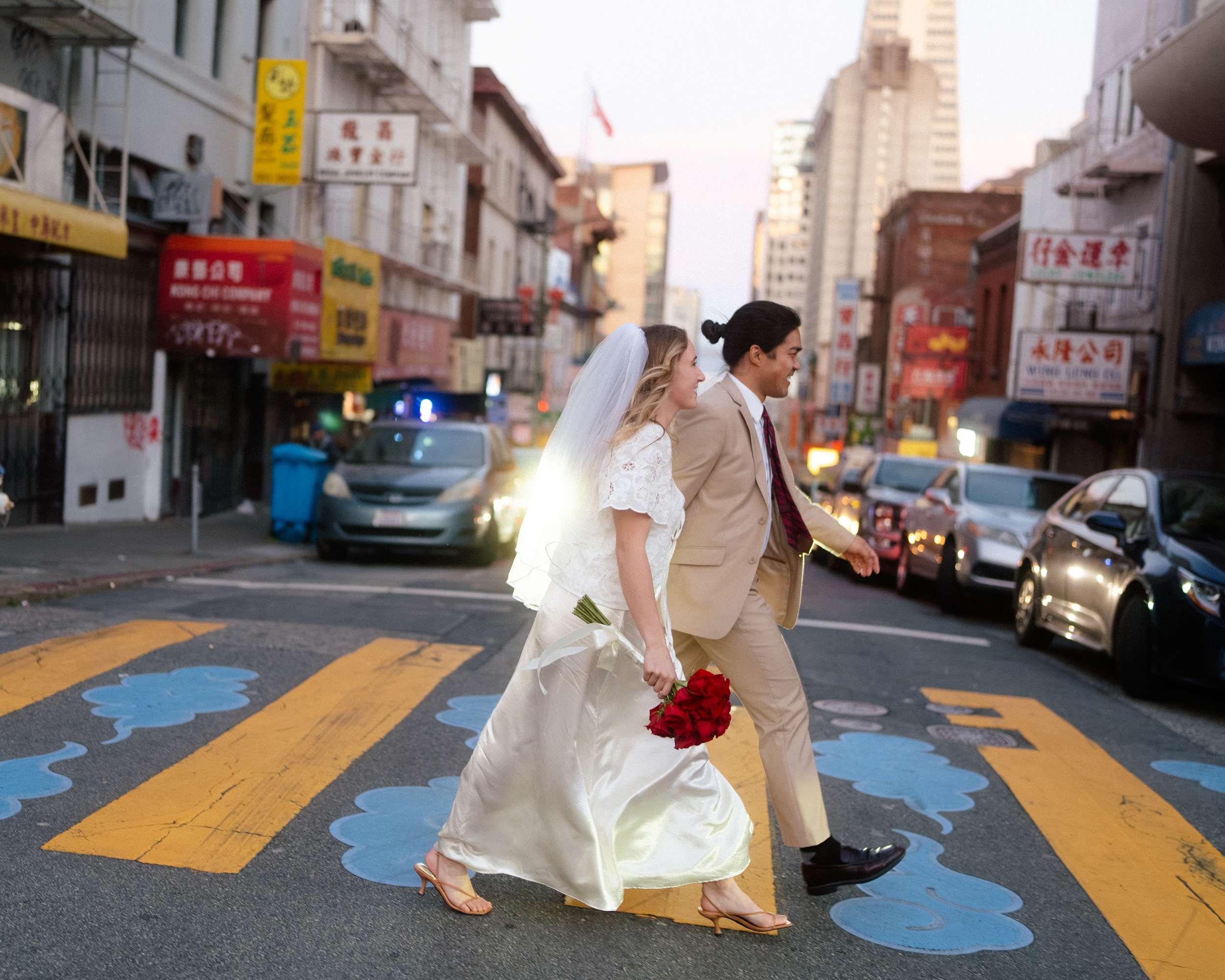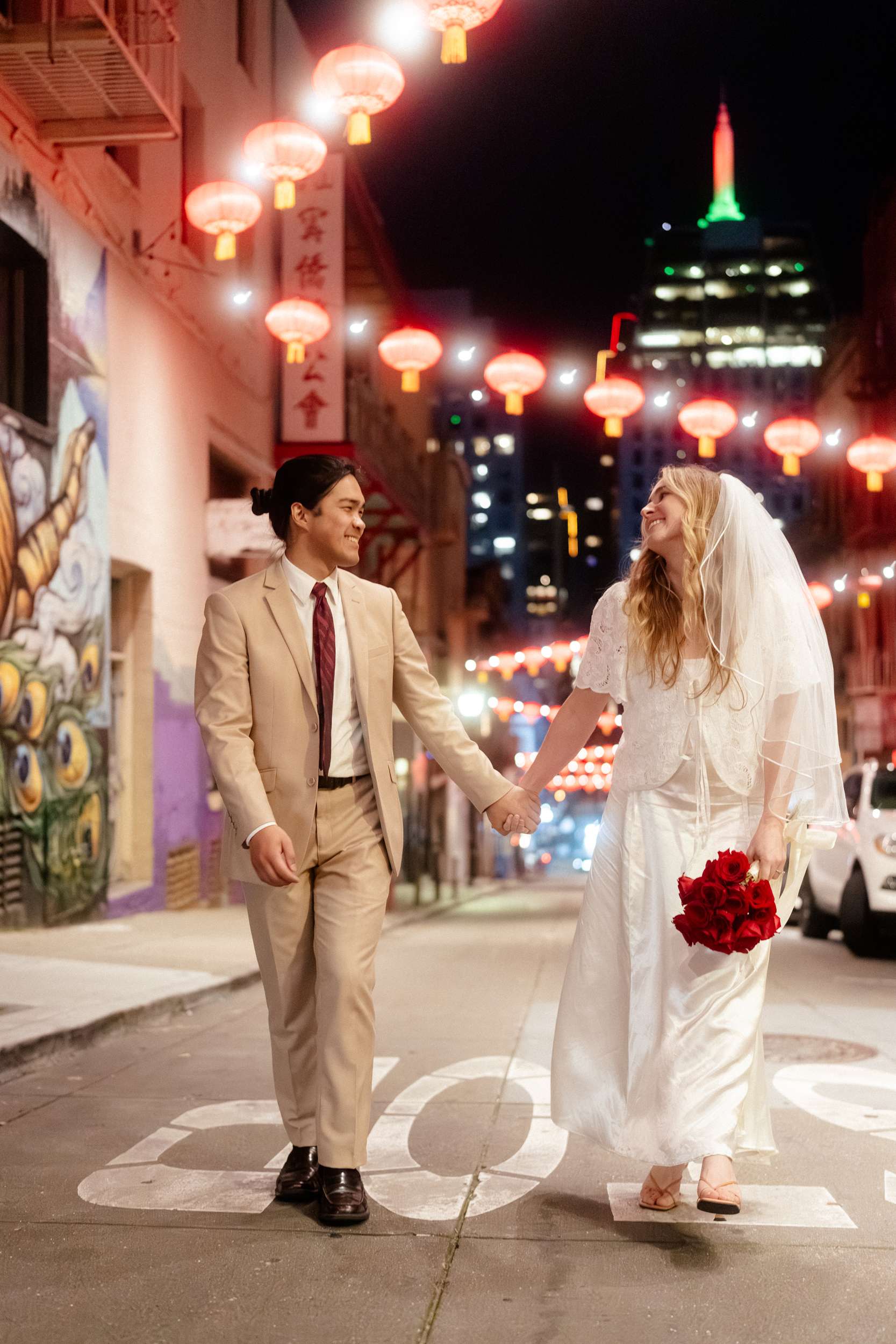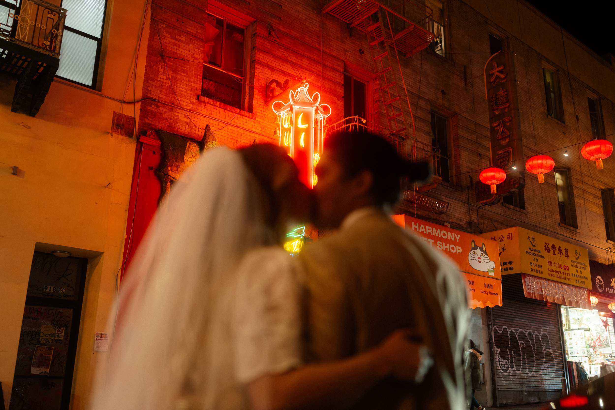 Sam and Kaylee wanted to honour both their backgrounds with a pre-wedding photo session. As a nod to Sam’s Hong Kong heritage (in a distinctly Asian-American way), the two chose to run around San Francisco Chinatown at night. They visited several beloved locally-owned Chinese-American businesses and Chinatown landmarks. Kaylee brought her own piece of family history to the session, wearing her grandmother’s wedding dress and her mother’s veil as a tribute to the women who came before her.
