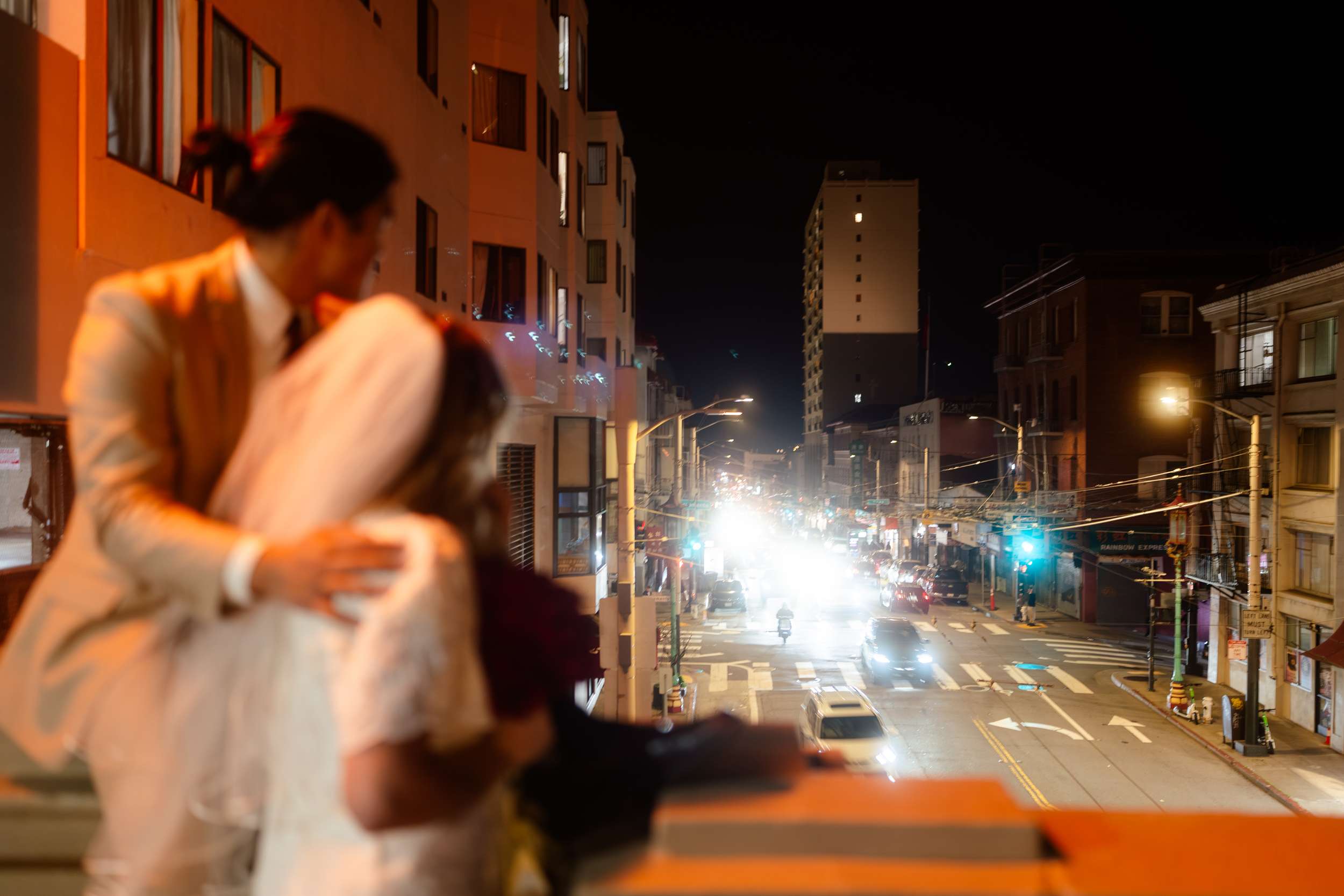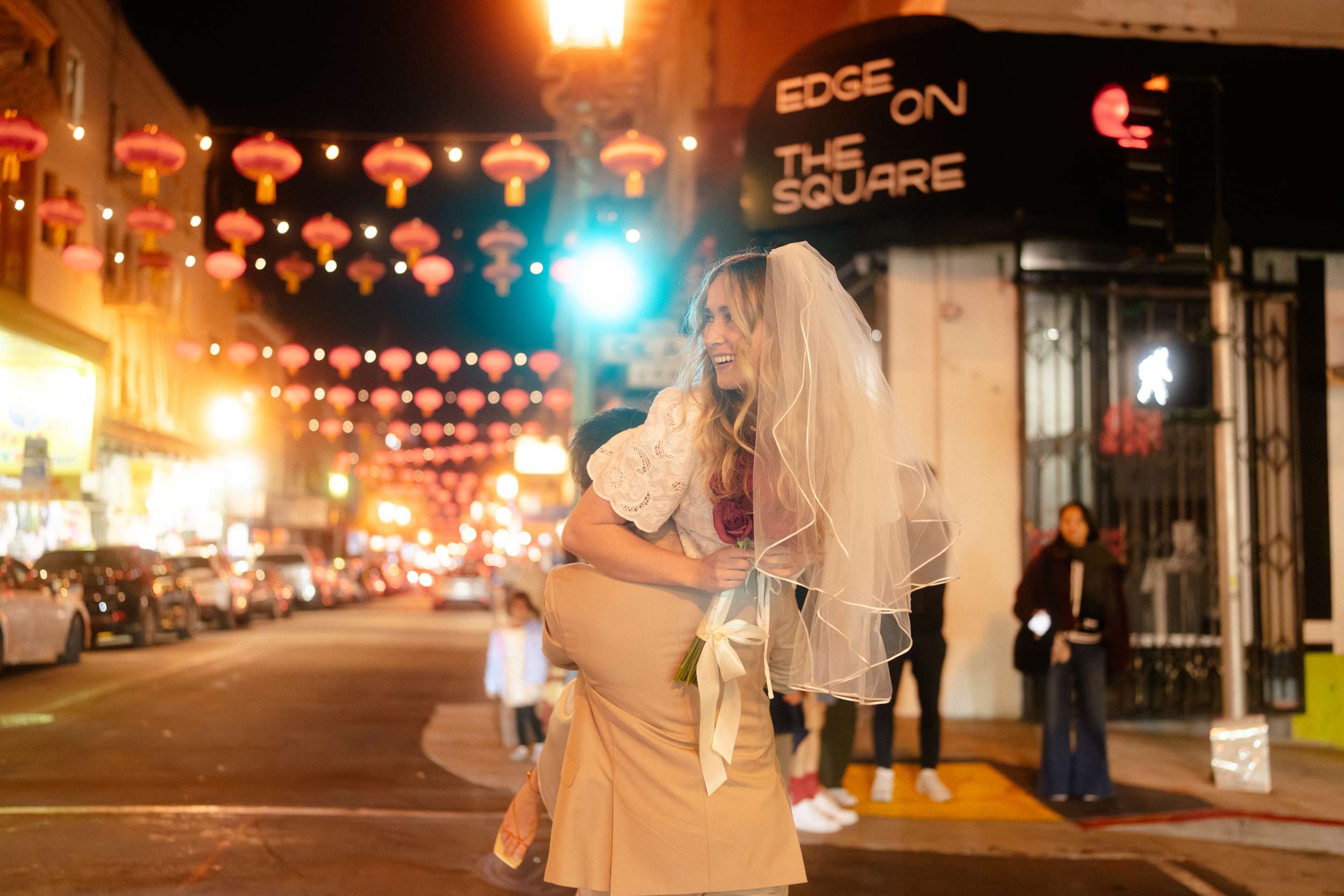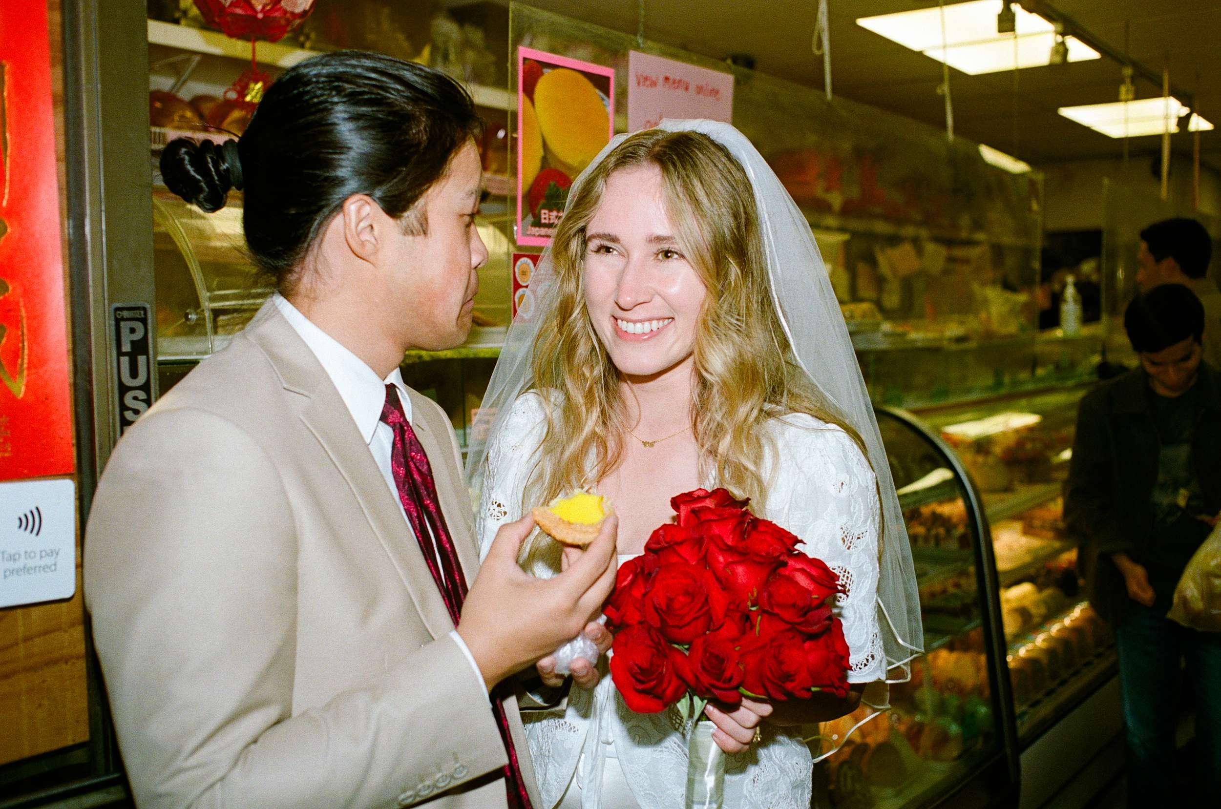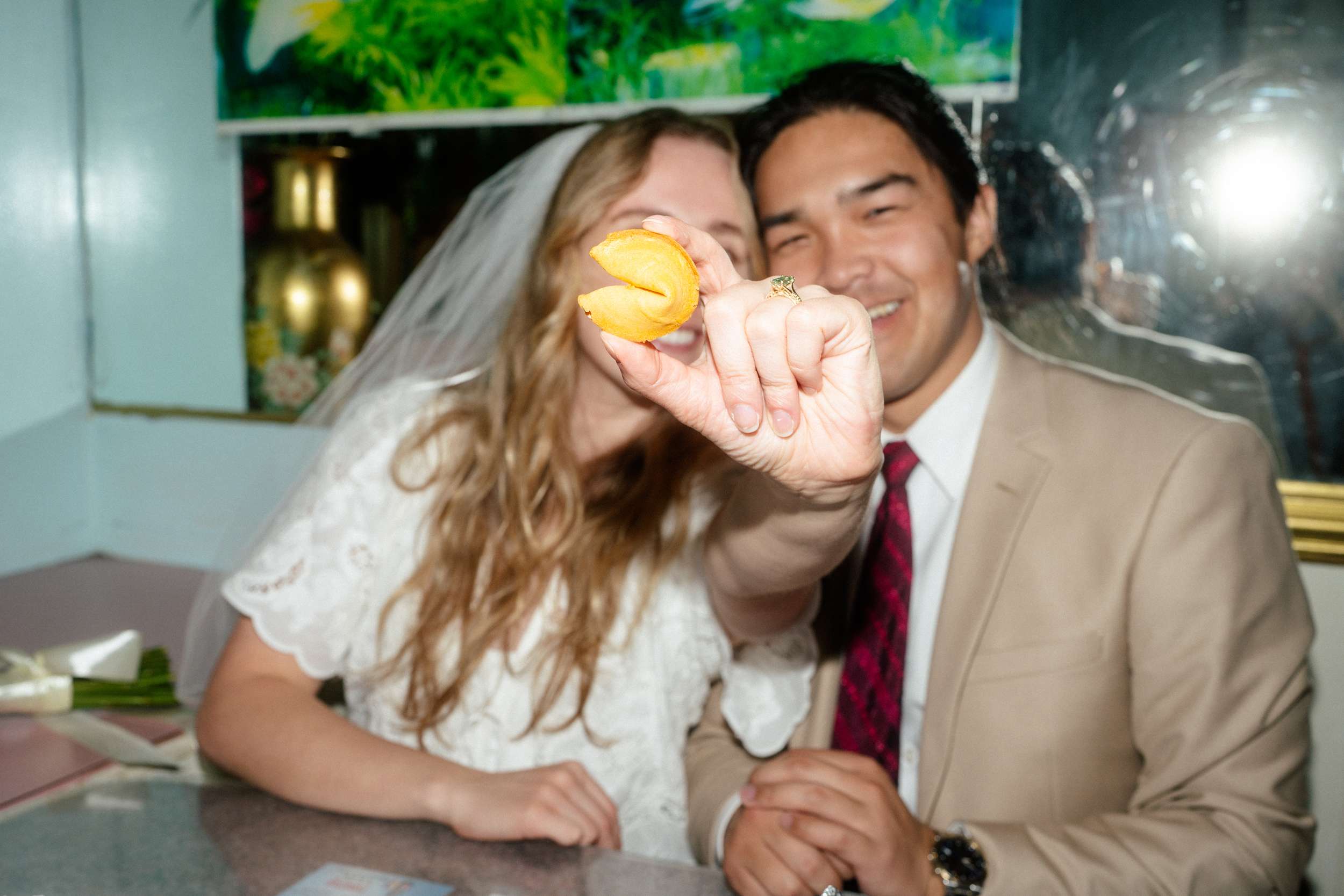 Sam and Kaylee wanted to honour both their backgrounds with a pre-wedding photo session. As a nod to Sam’s Hong Kong heritage (in a distinctly Asian-American way), the two chose to run around San Francisco Chinatown at night. They visited several beloved locally-owned Chinese-American businesses and Chinatown landmarks. Kaylee brought her own piece of family history to the session, wearing her grandmother’s wedding dress and her mother’s veil as a tribute to the women who came before her.