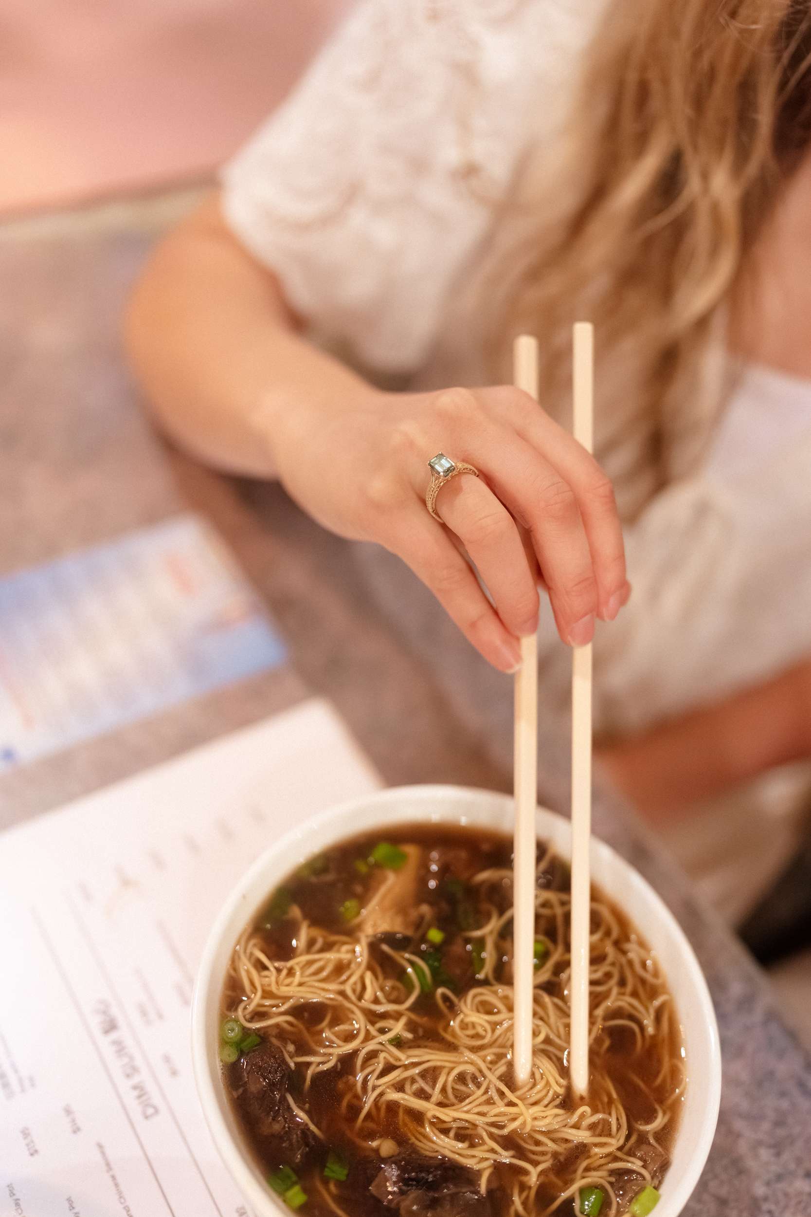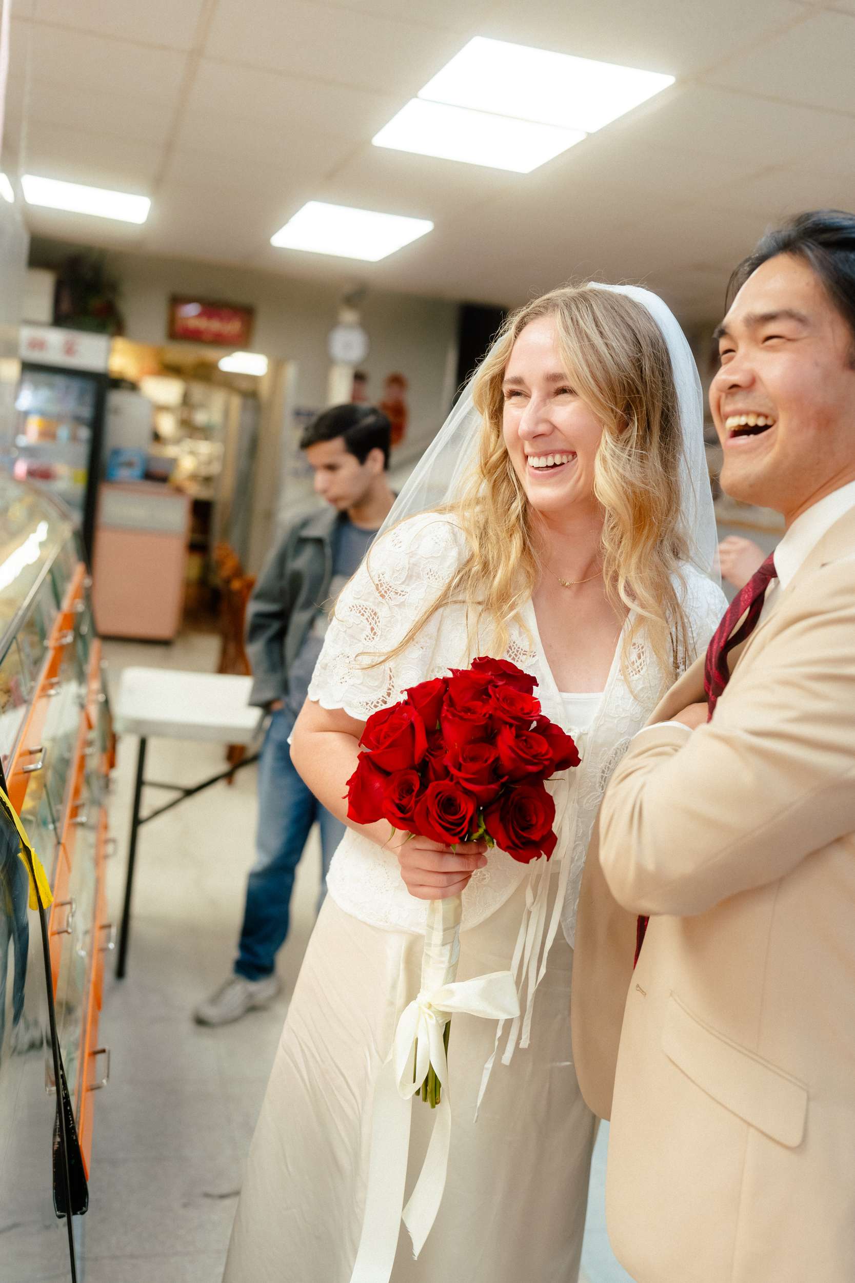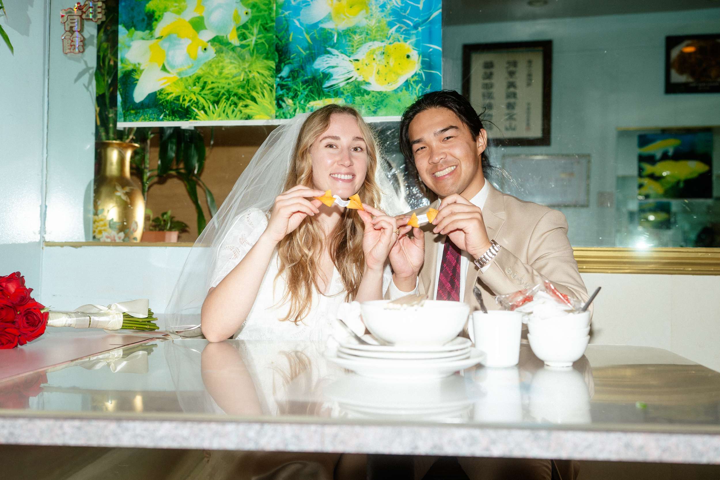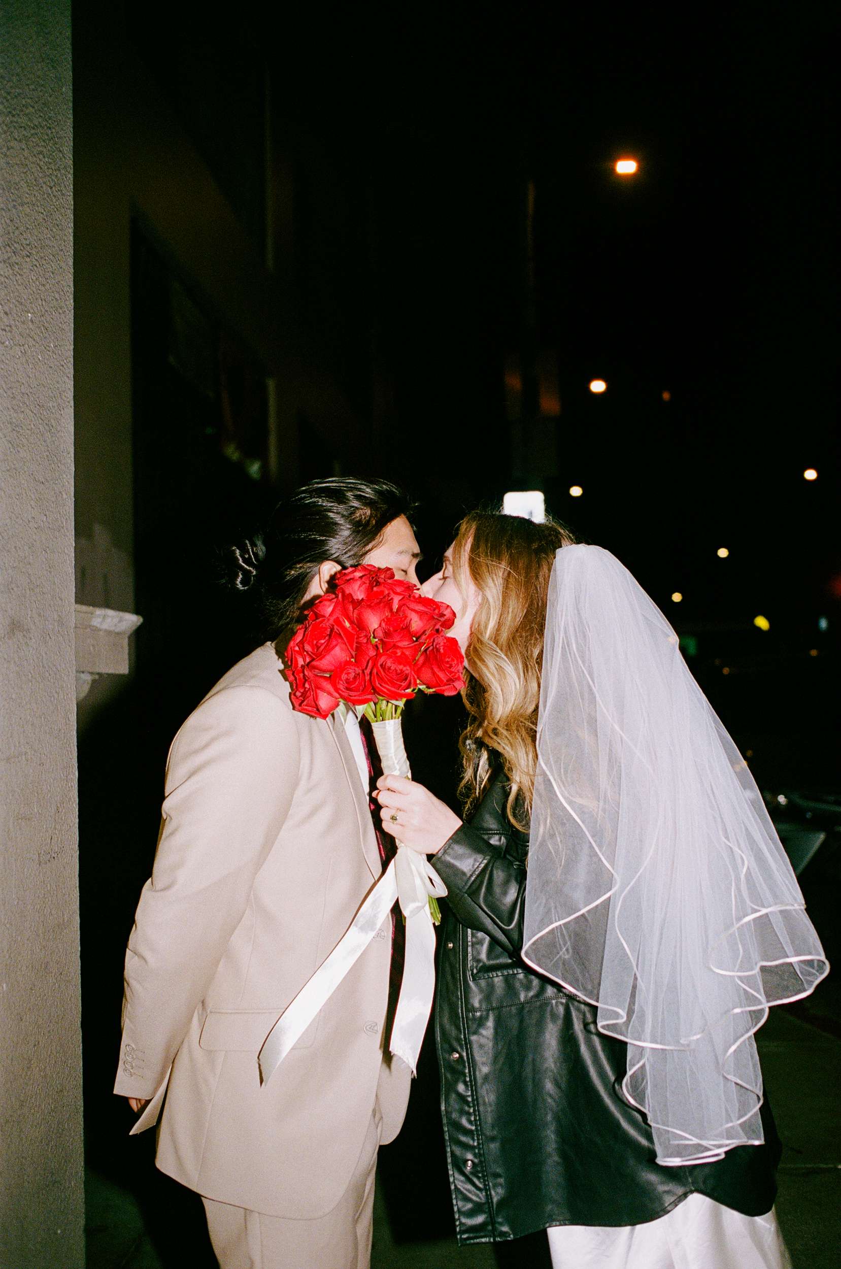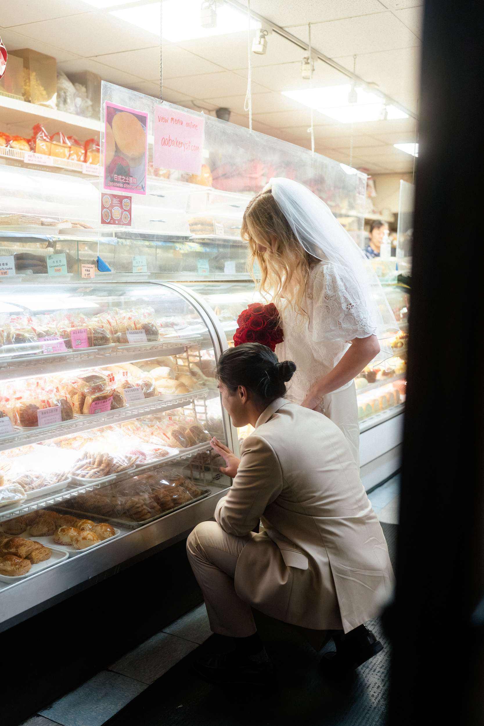 Sam and Kaylee wanted to honour both their backgrounds with a pre-wedding photo session. As a nod to Sam’s Hong Kong heritage (in a distinctly Asian-American way), the two chose to run around San Francisco Chinatown at night. They visited several beloved locally-owned Chinese-American businesses and Chinatown landmarks. Kaylee brought her own piece of family history to the session, wearing her grandmother’s wedding dress and her mother’s veil as a tribute to the women who came before her.