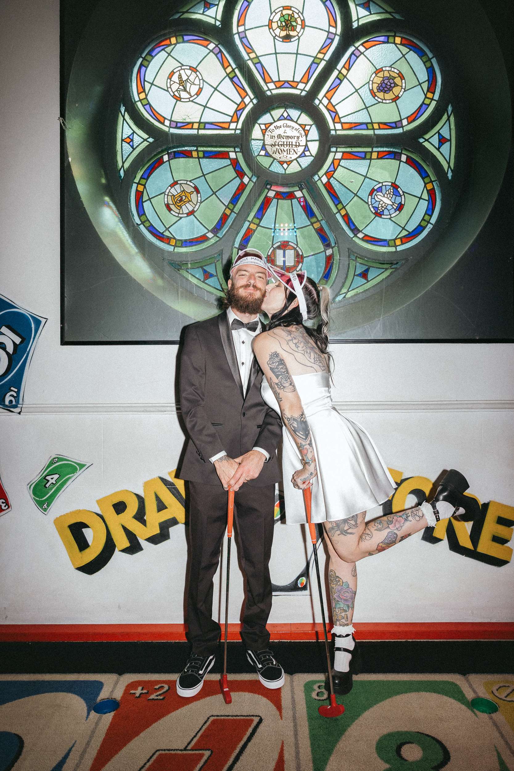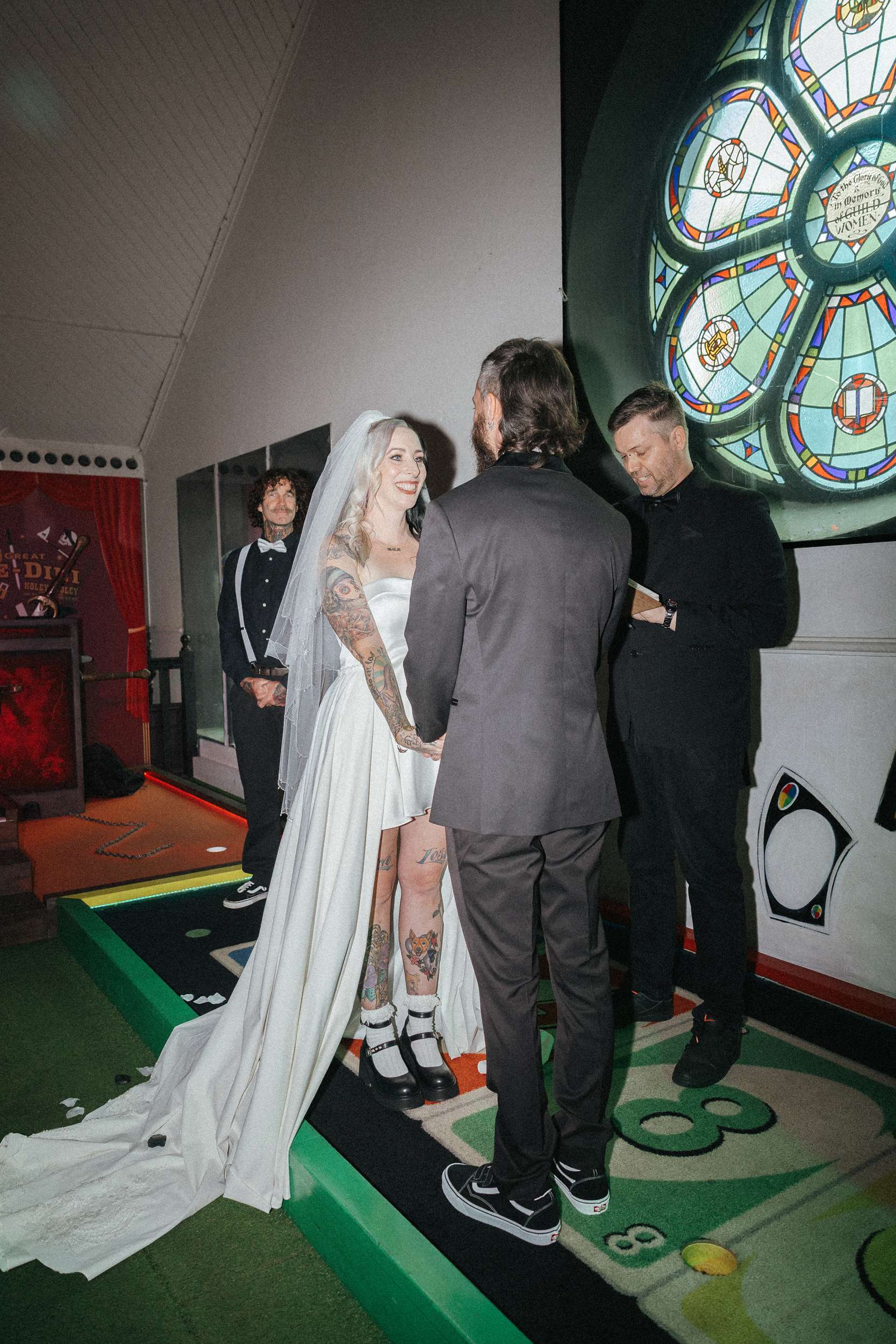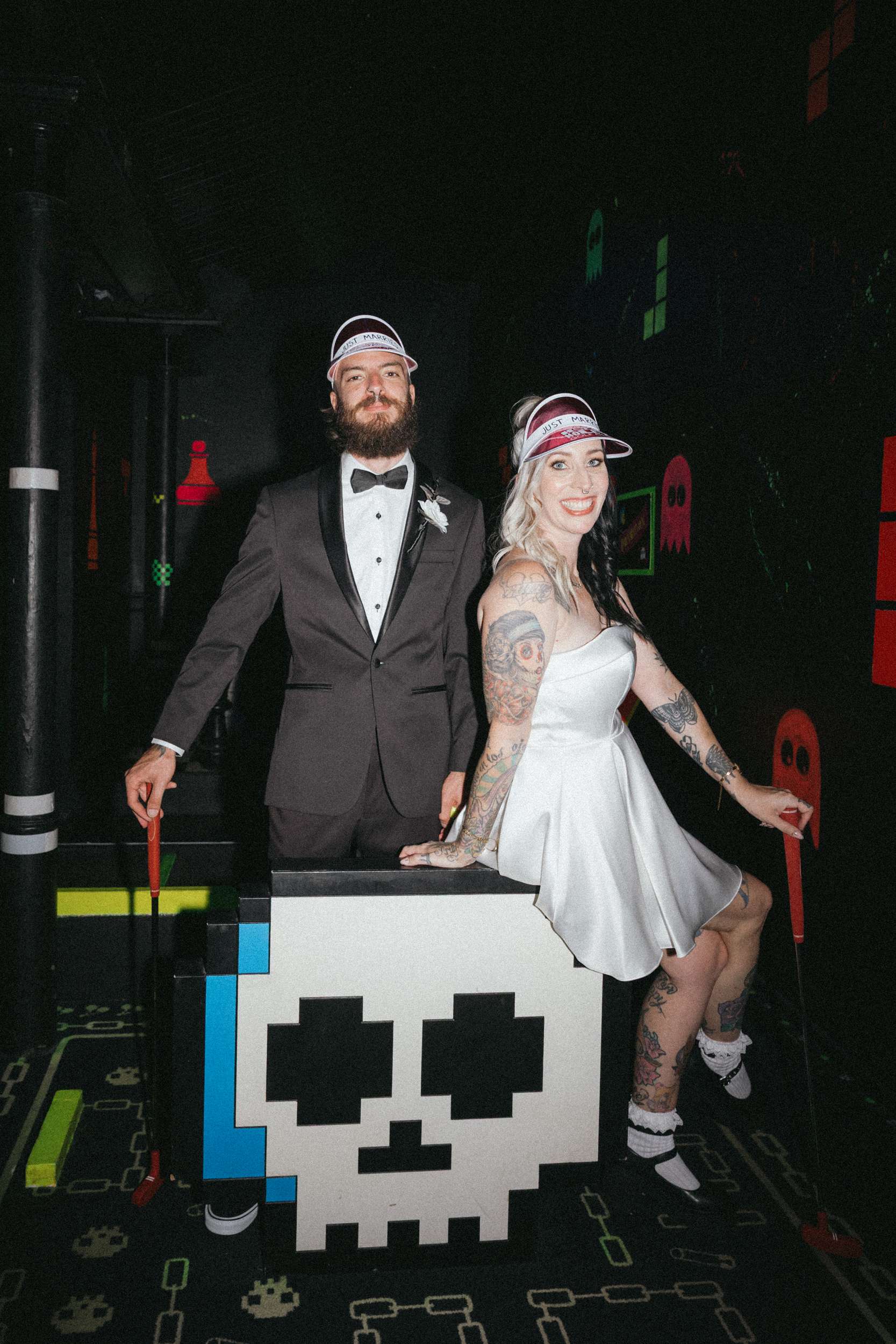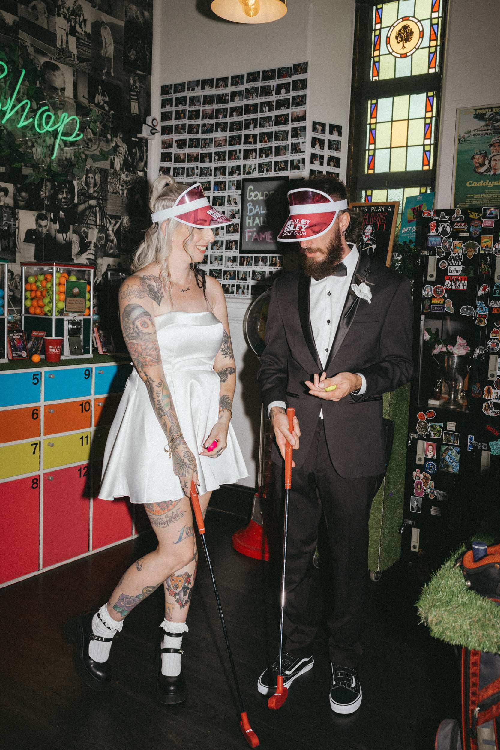 A and S got married at Holey Moley in Fortitude Valley, a crazy golf place which had been a regular date night stop whenever they were in Brisbane. Set inside an old church and black and white on the outside, it was perfect for their aesthetic and loud and playful inside which was perfect for their personalities!