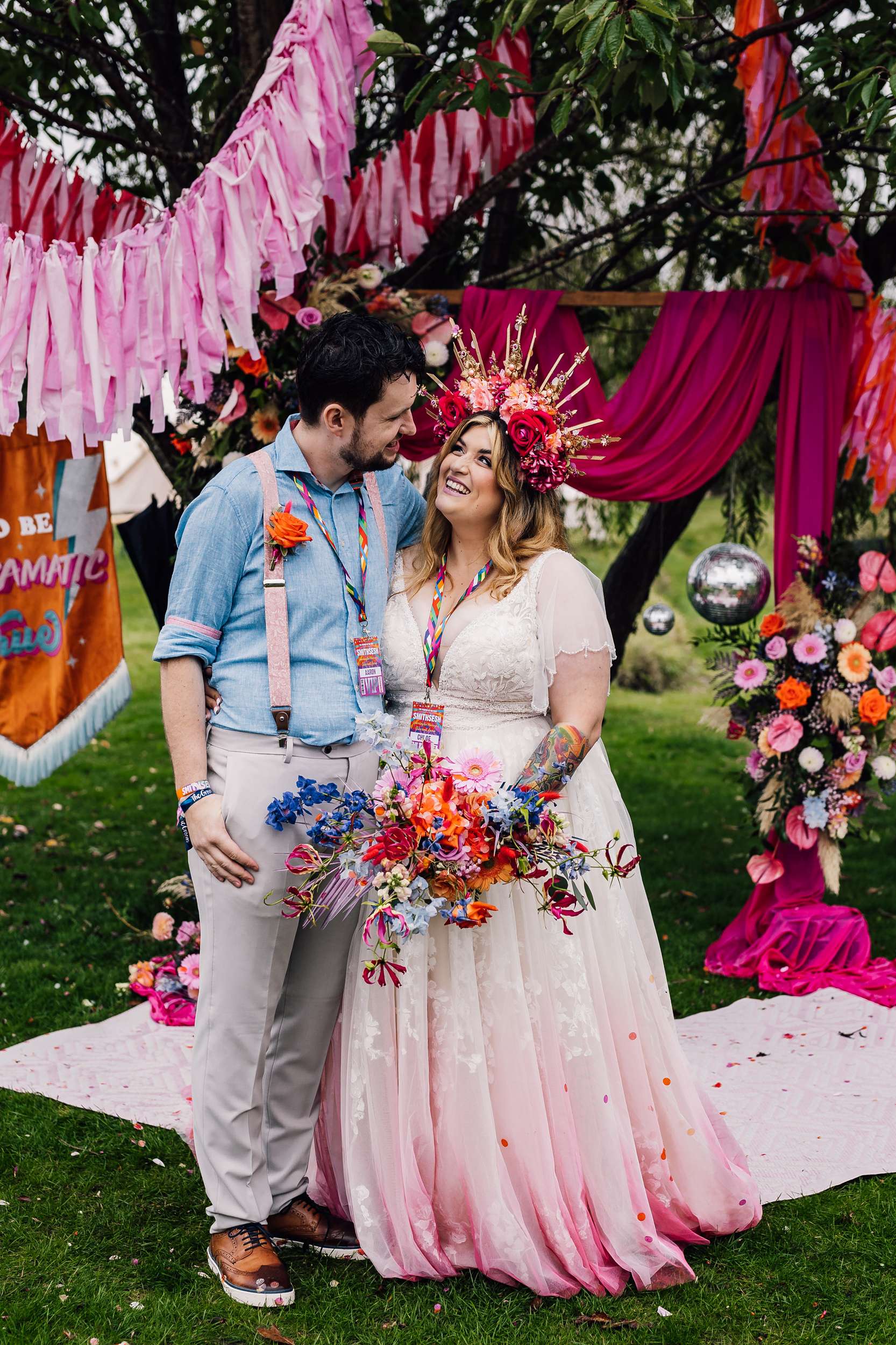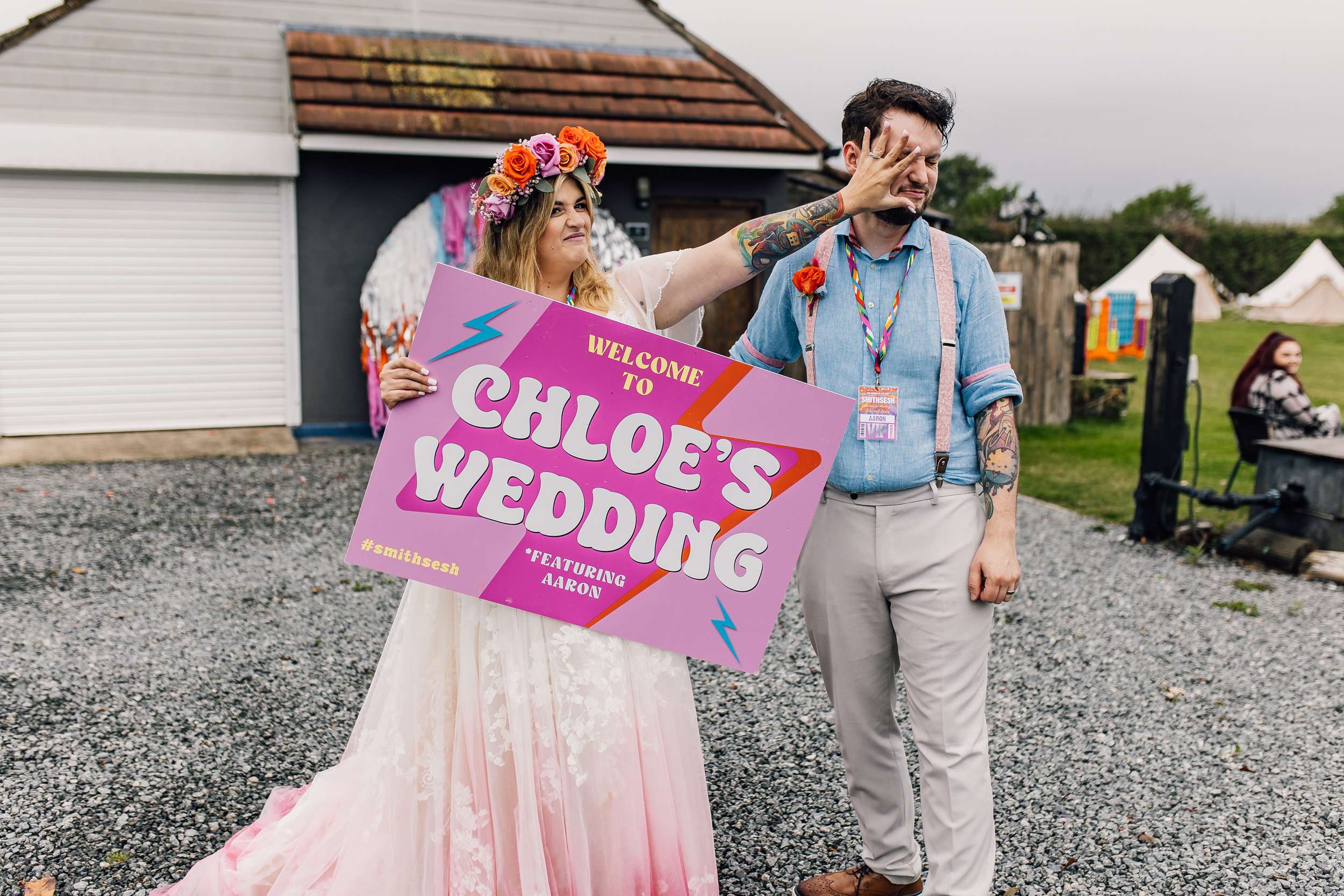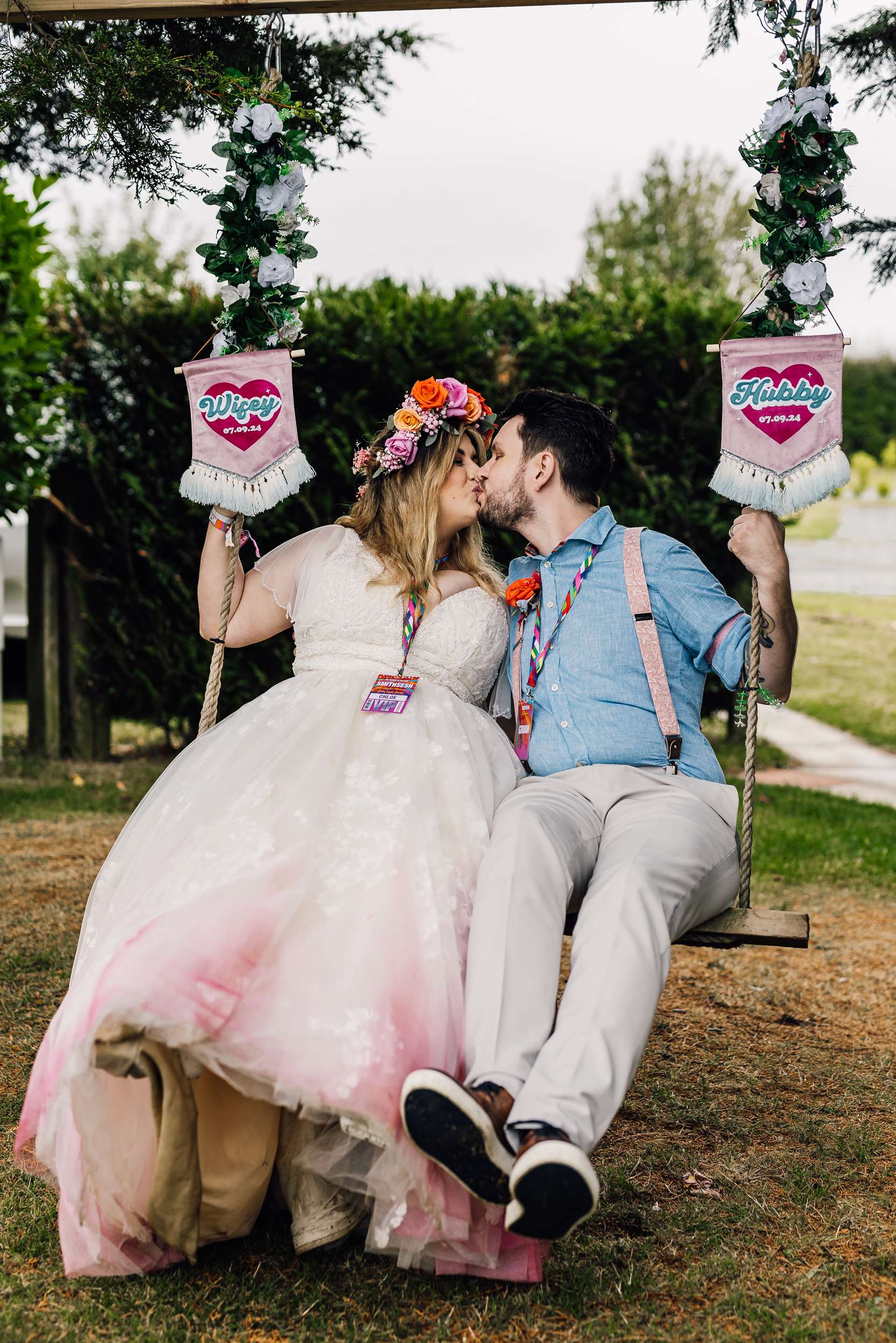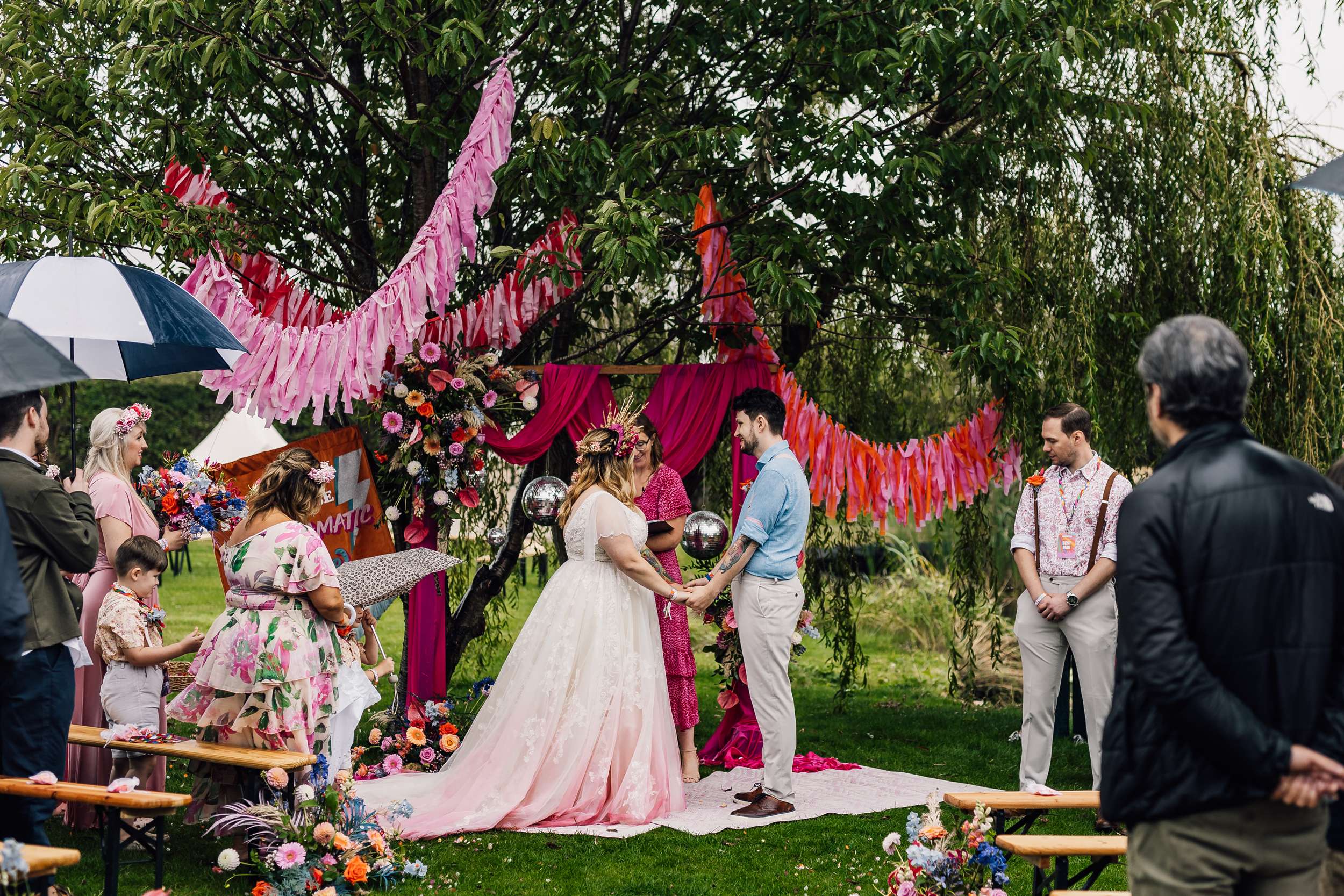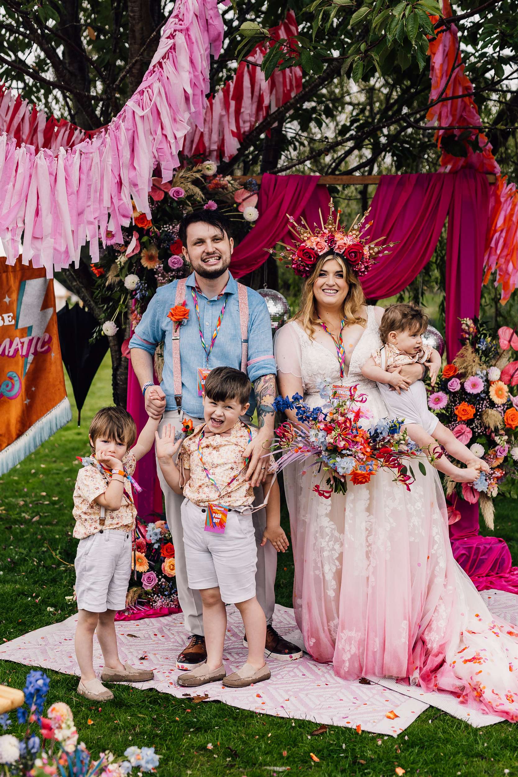Chloe and Aaron’s colourful festival wedding in Hull was all about their personalities, their love of colour and not taking themselves too seriously. The couple, who have been together since they were 17, and their three children threw a celebration was full of laughter, games and in-jokes. And despite it raining all morning (even during their outdoor ceremony!) their spirits were not dampened one little bit. “We did not want a traditional wedding as it really wasn’t us”, they said, “we only wanted things we cared about or would enjoy there”
