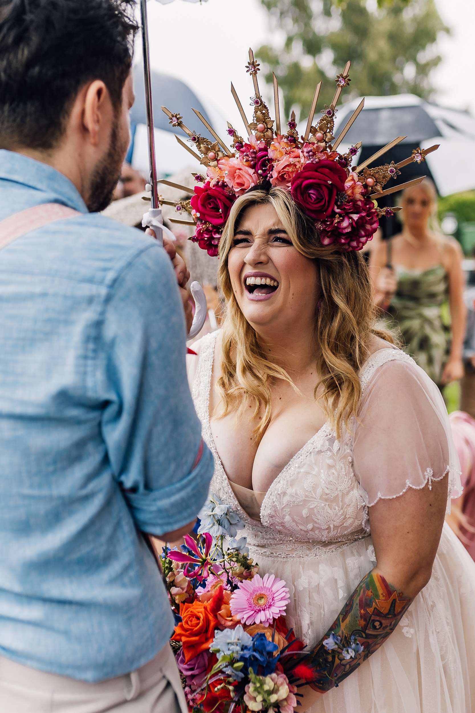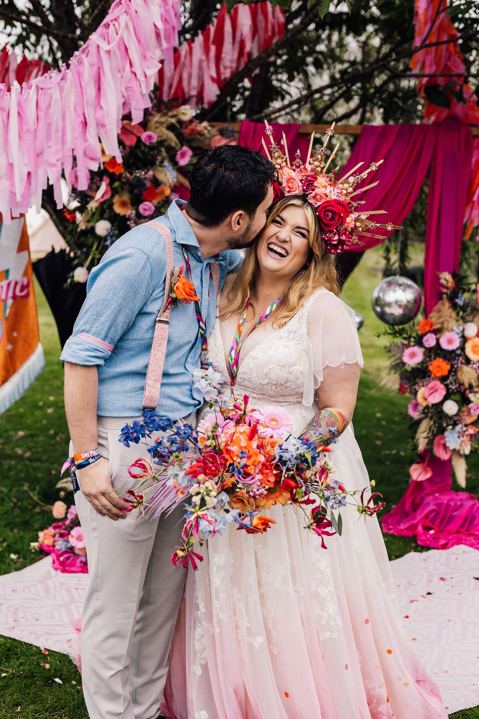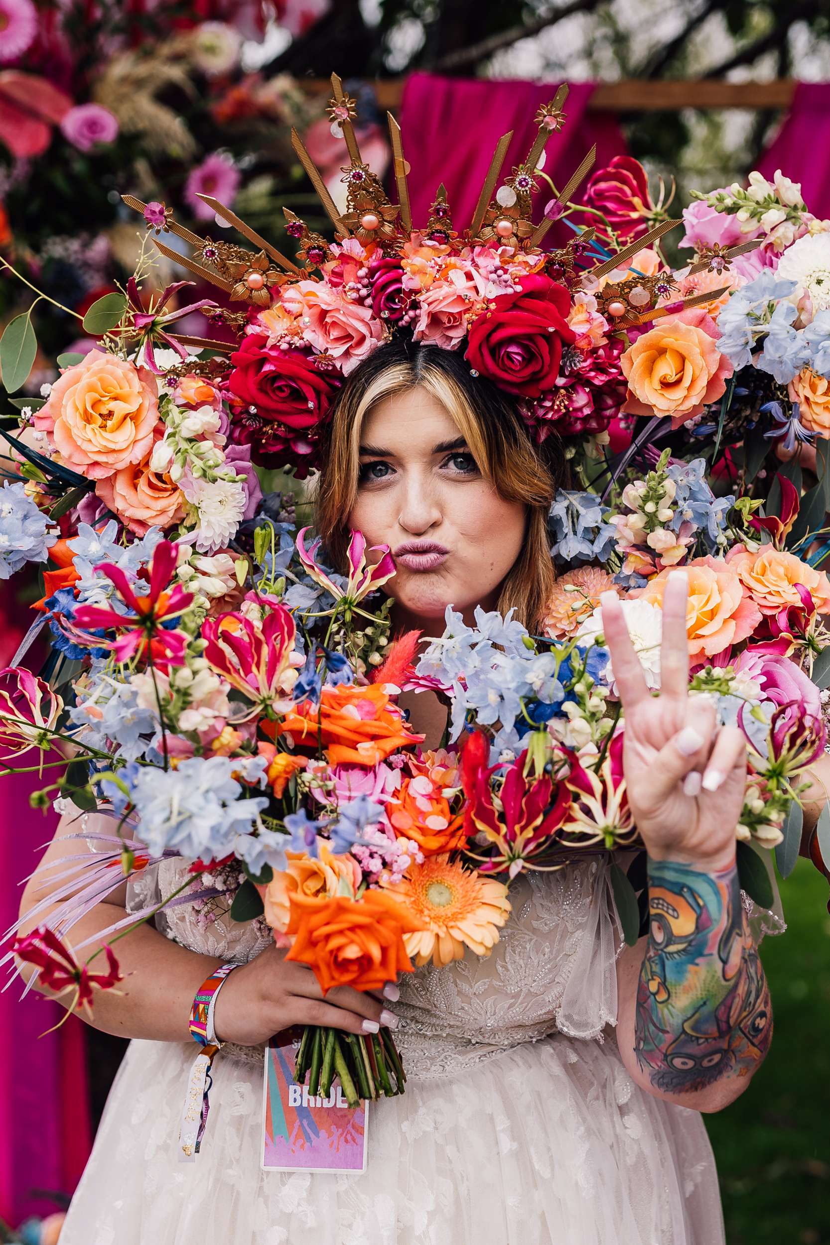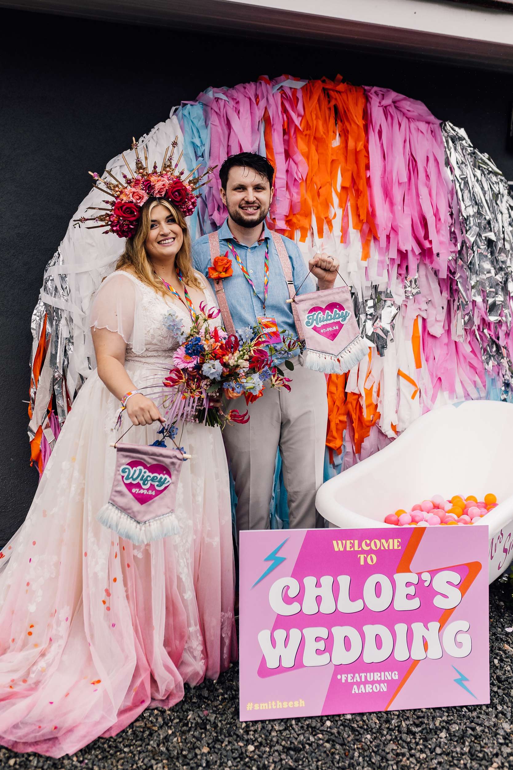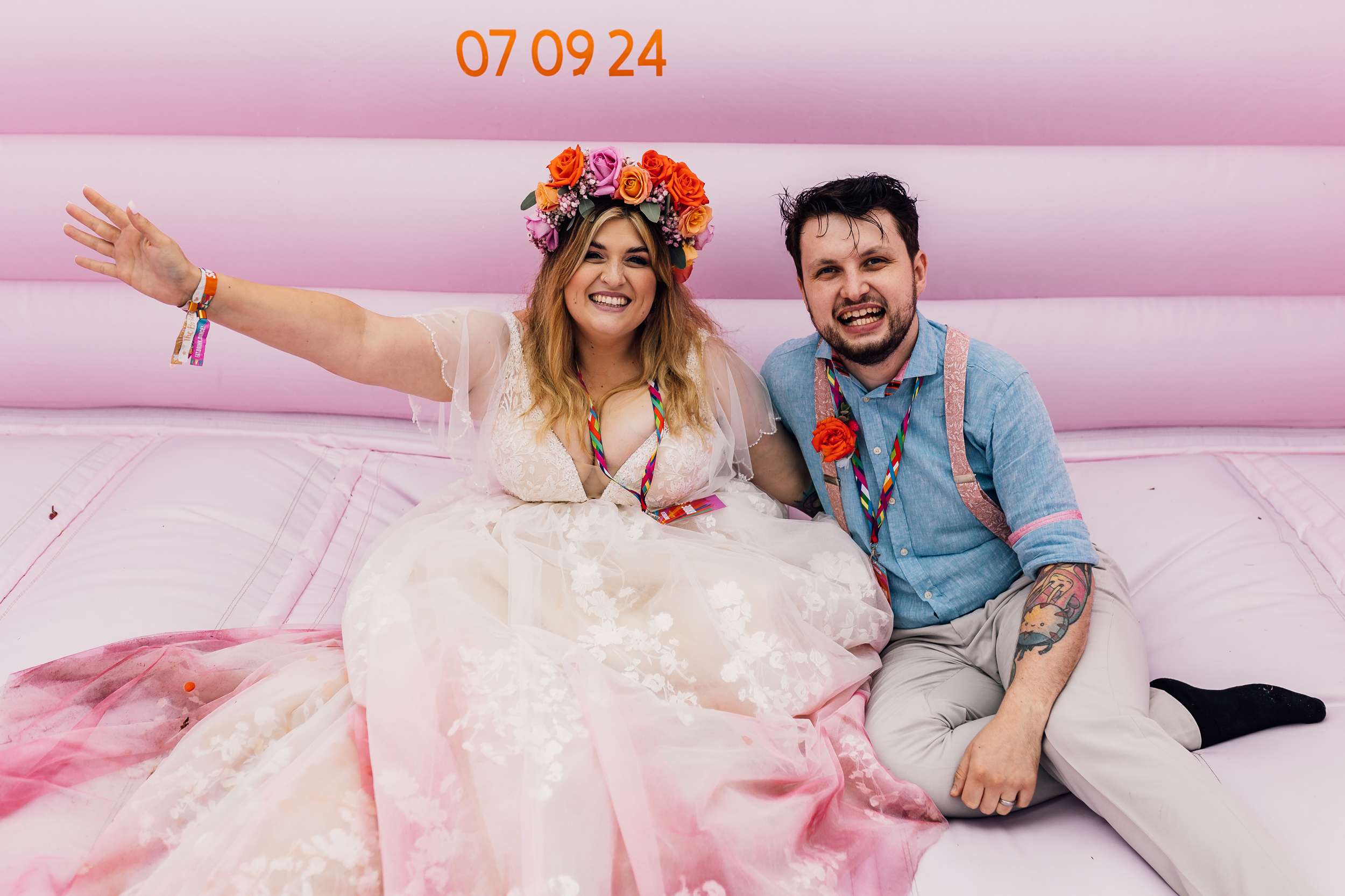 Chloe and Aaron’s colourful festival wedding in Hull was all about their personalities, their love of colour and not taking themselves too seriously. The couple, who have been together since they were 17, and their three children threw a celebration was full of laughter, games and in-jokes. And despite it raining all morning (even during their outdoor ceremony!) their spirits were not dampened one little bit. “We did not want a traditional wedding as it really wasn’t us”, they said, “we only wanted things we cared about or would enjoy there”