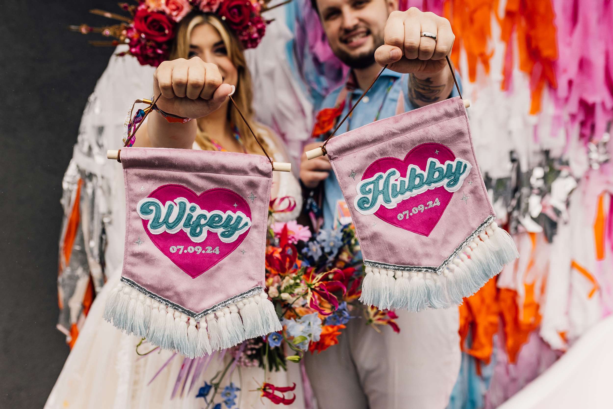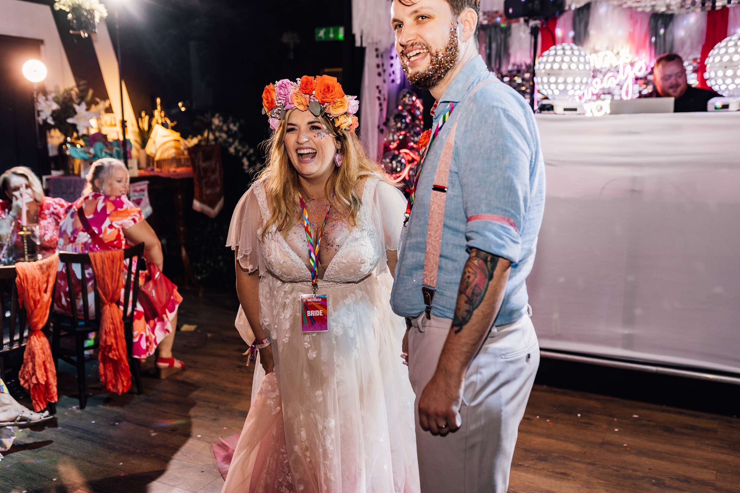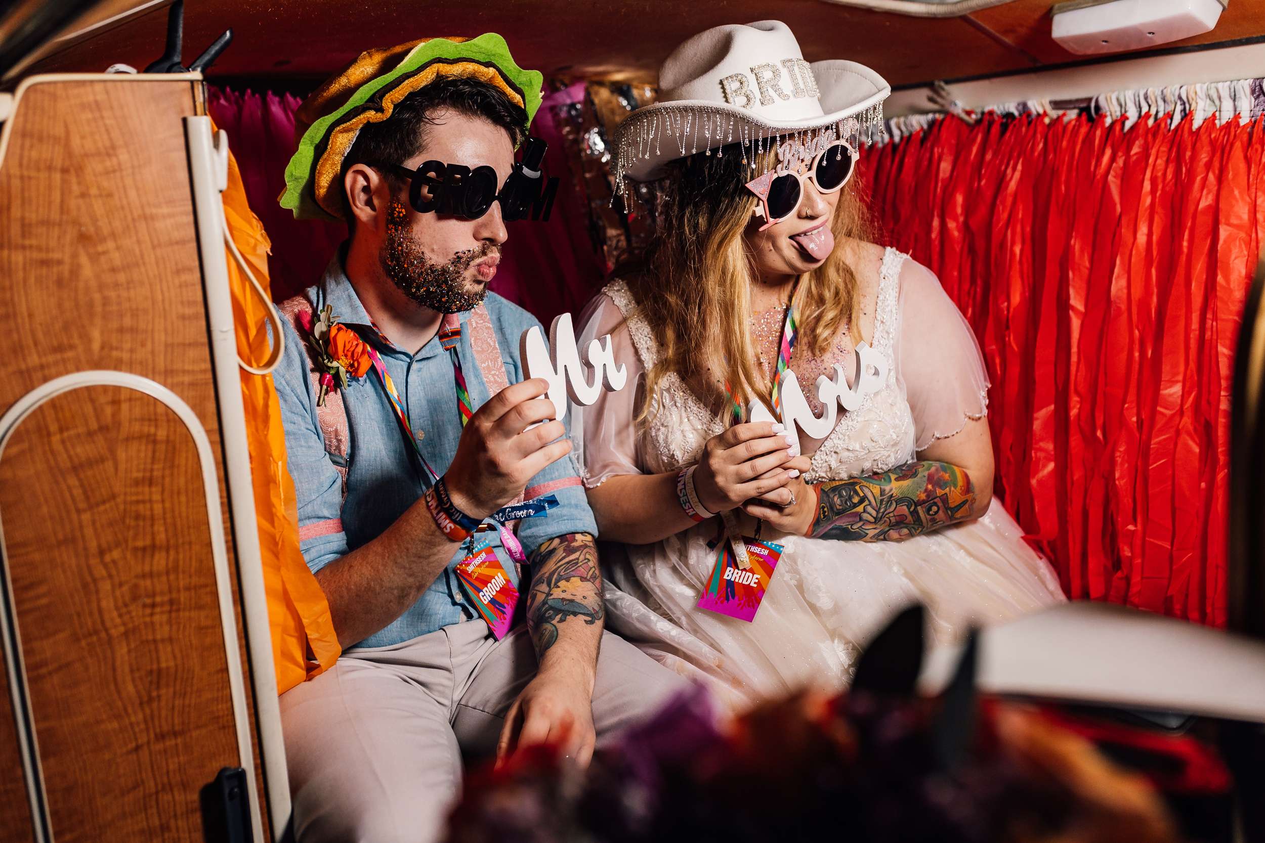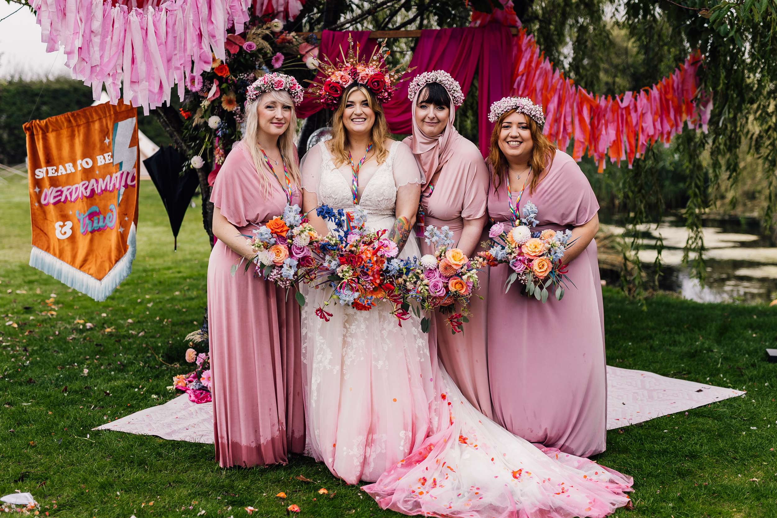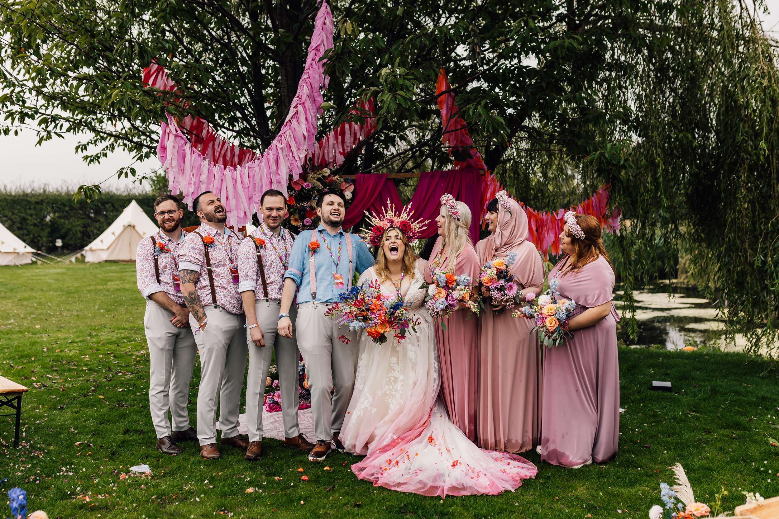 Chloe and Aaron’s colourful festival wedding in Hull was all about their personalities, their love of colour and not taking themselves too seriously. The couple, who have been together since they were 17, and their three children threw a celebration was full of laughter, games and in-jokes. And despite it raining all morning (even during their outdoor ceremony!) their spirits were not dampened one little bit. “We did not want a traditional wedding as it really wasn’t us”, they said, “we only wanted things we cared about or would enjoy there”