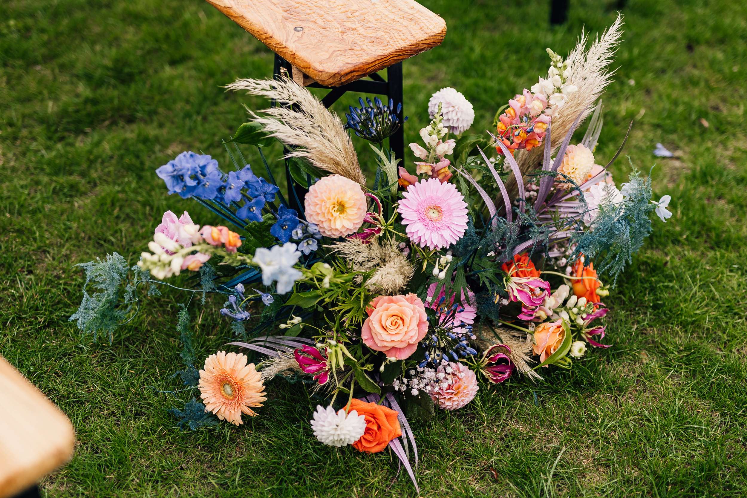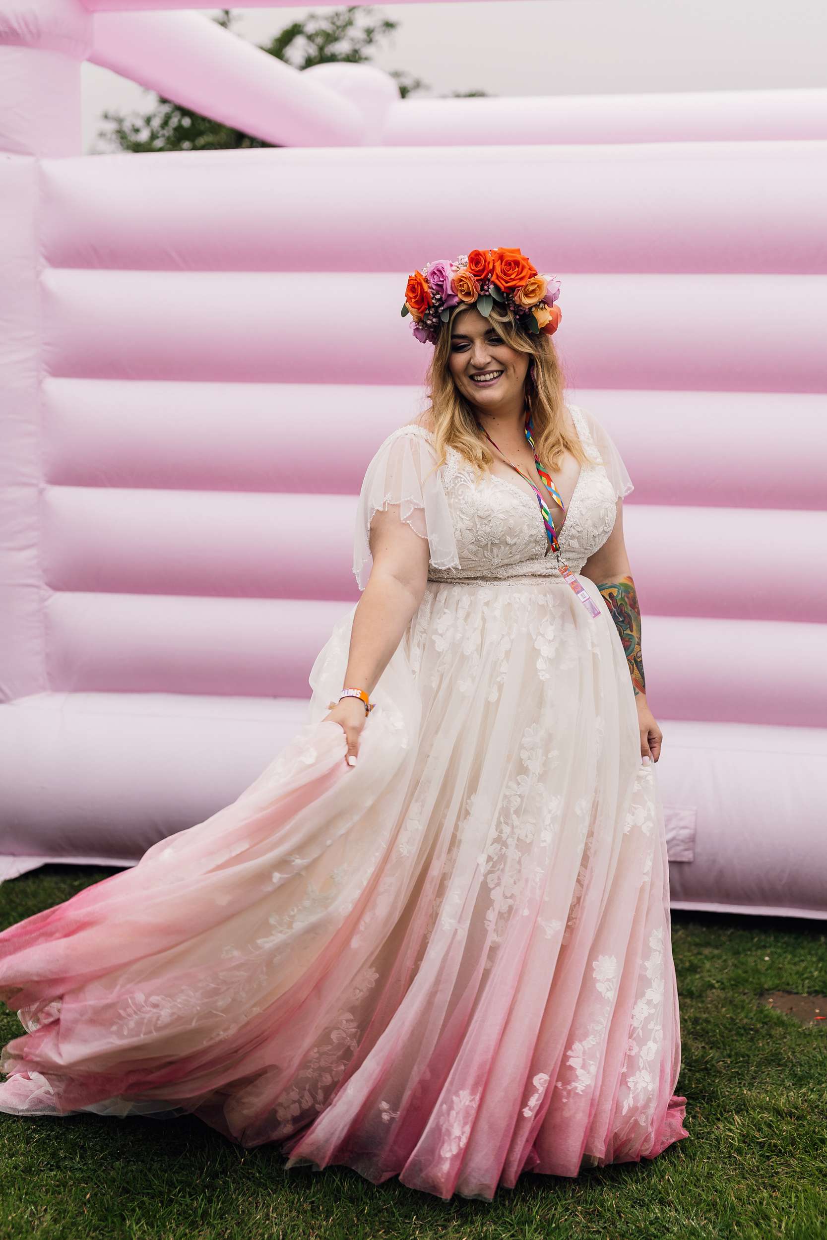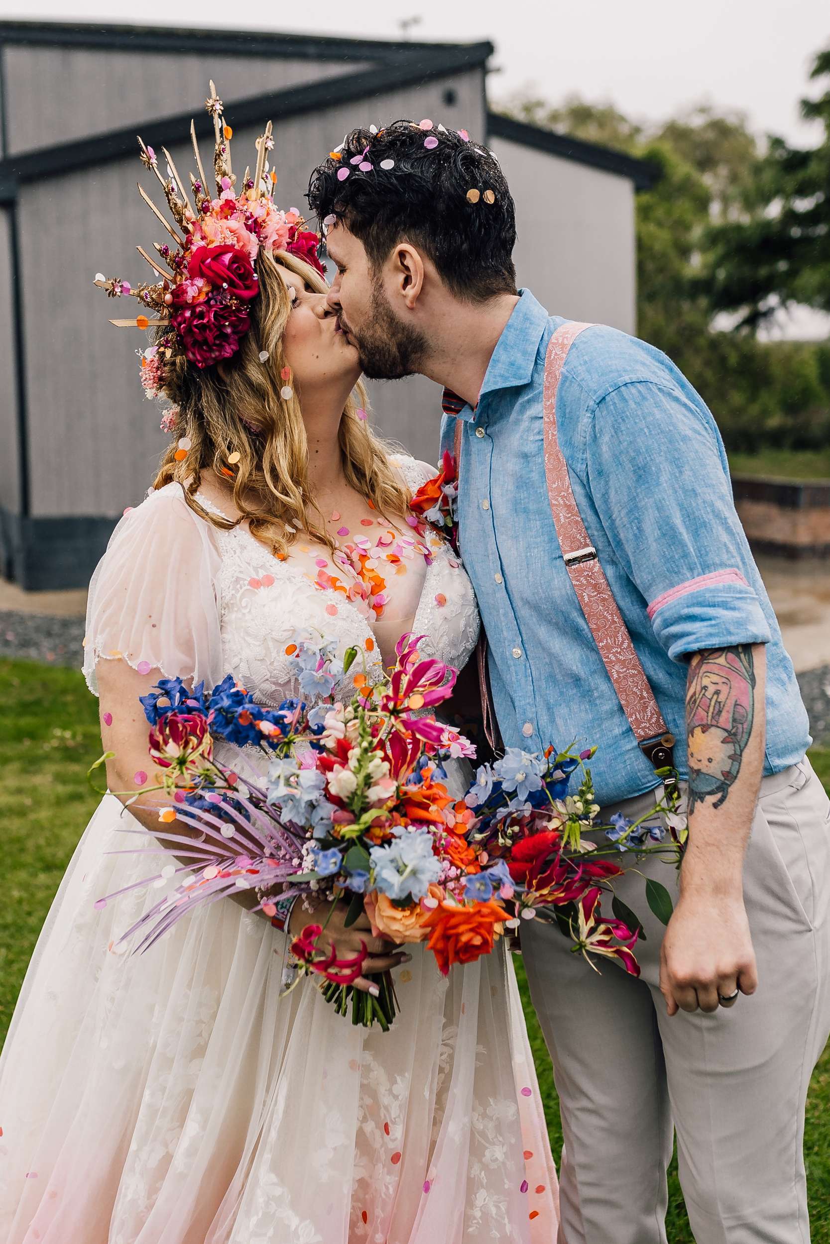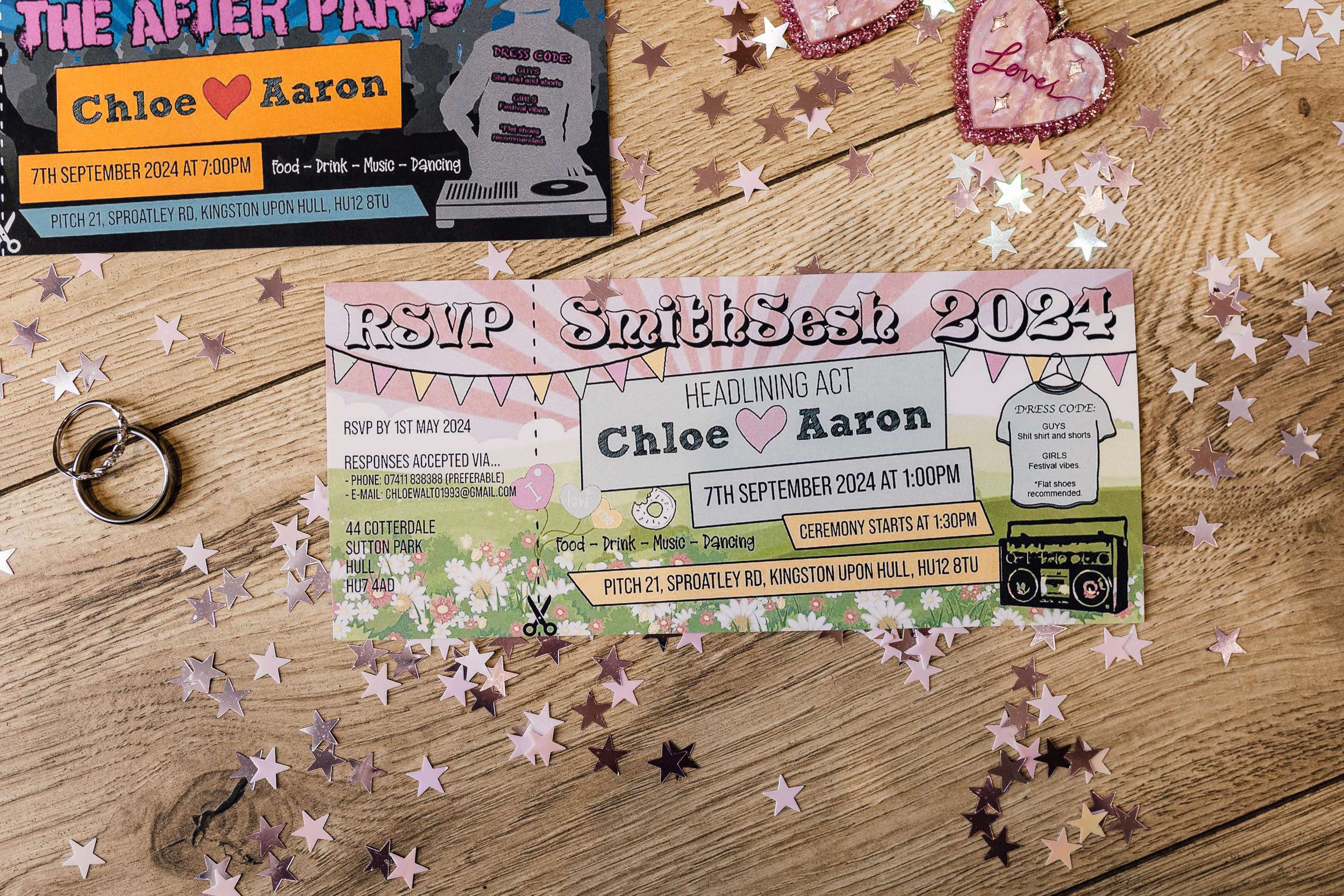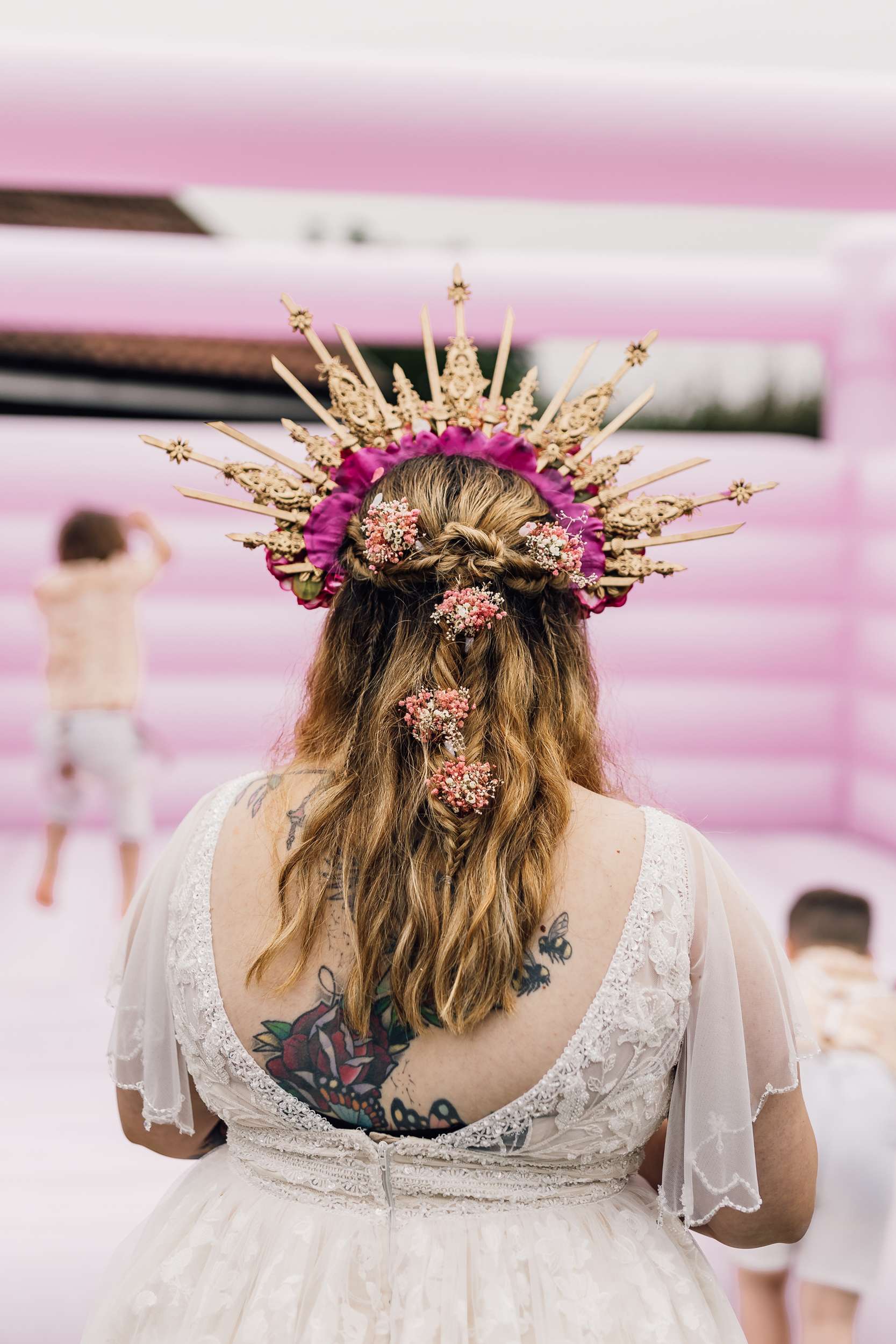 Chloe and Aaron’s colourful festival wedding in Hull was all about their personalities, their love of colour and not taking themselves too seriously. The couple, who have been together since they were 17, and their three children threw a celebration was full of laughter, games and in-jokes. And despite it raining all morning (even during their outdoor ceremony!) their spirits were not dampened one little bit. “We did not want a traditional wedding as it really wasn’t us”, they said, “we only wanted things we cared about or would enjoy there”