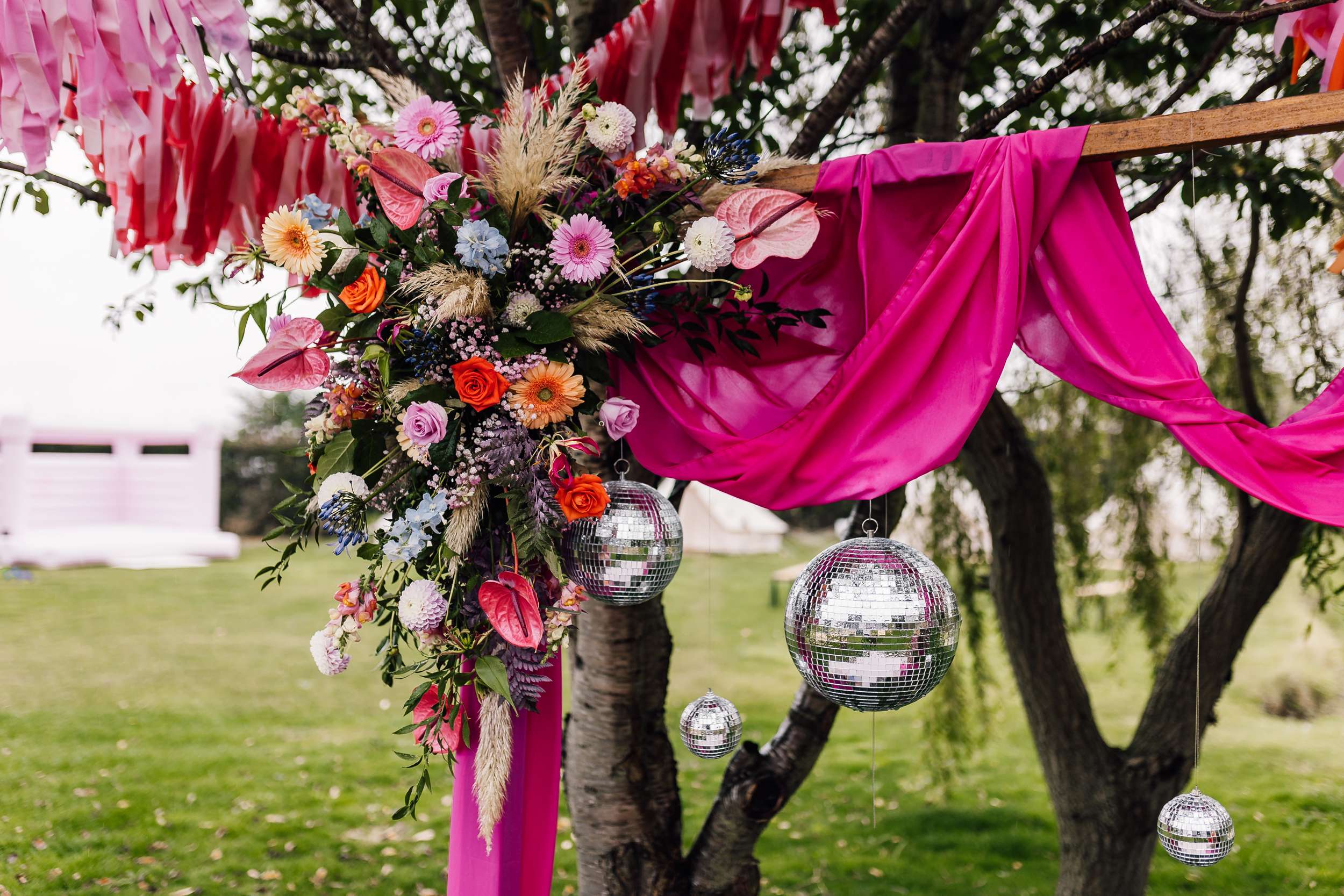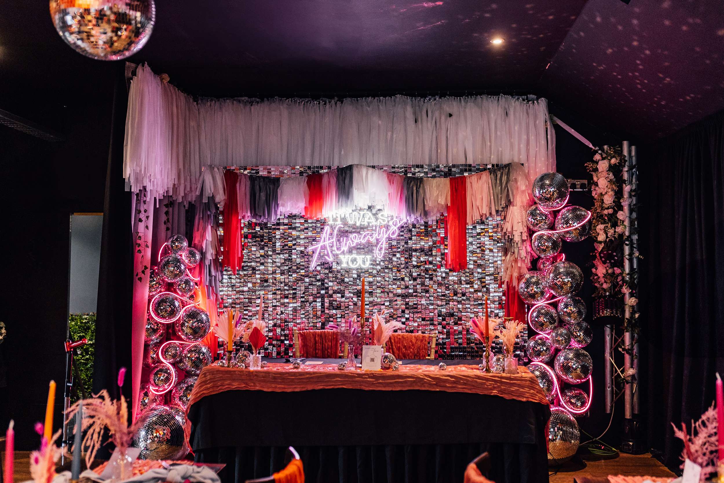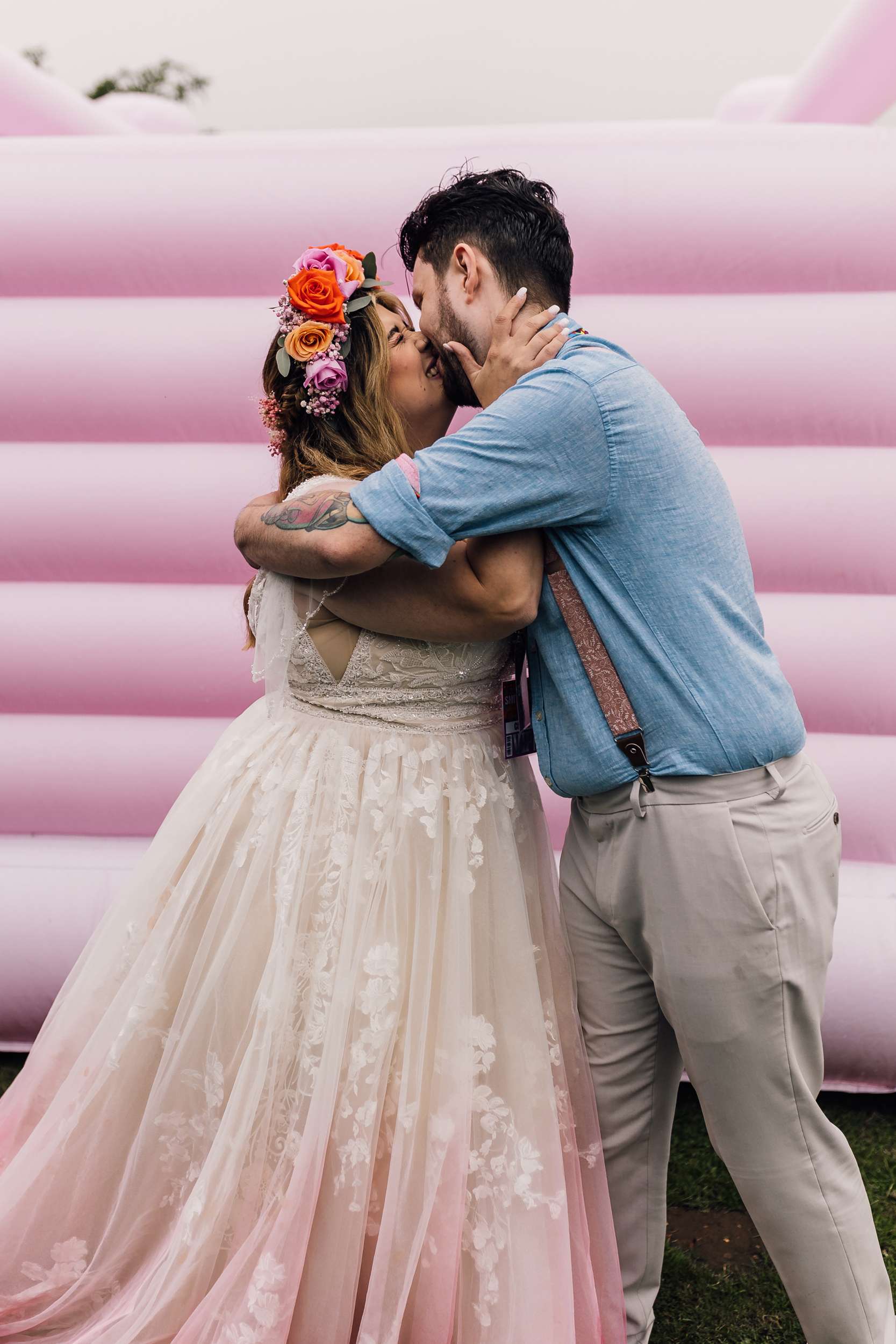 Luna Moon Events transformed the space with bright, bold styling – disco balls, neon lights, colourful streamers, custom signs, There were chillout areas, a glitter bar, a photo booth, a bouncy castle and games like Beer Pong and Connect 4 which were played by guests all day. They had a children’s entertainer for the kids, who did magic tricks and balloon animals.
