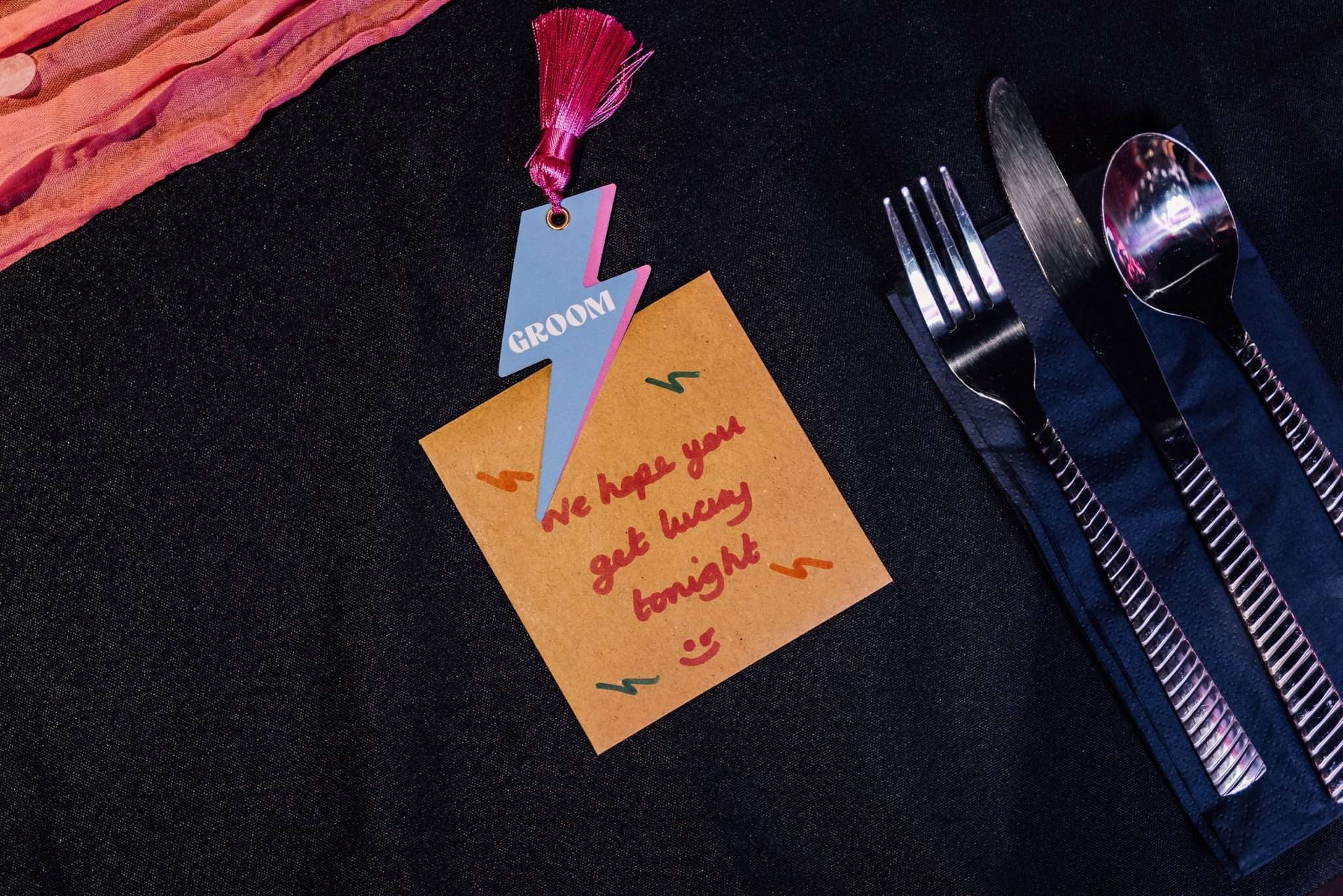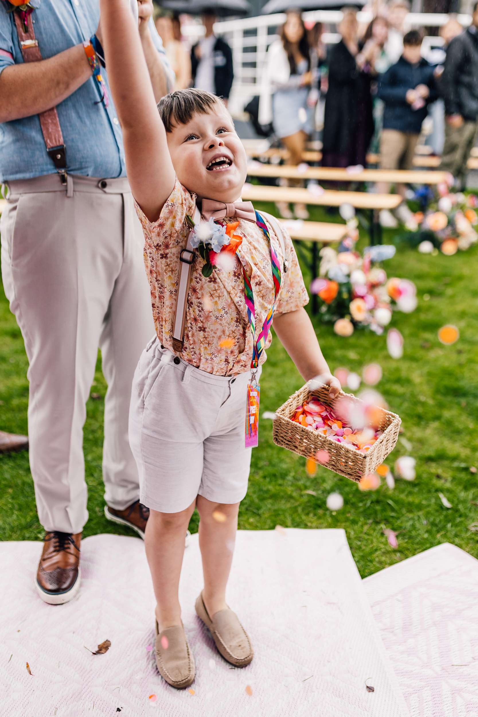 “Our celebrant did a fantastic job bringing in lots of references to our lives (e.g. gaming, bingo) and we hadn’t seen what she was going to say prior to the ceremony. It was very much living in the moment, like us! Our kids also joined in during the ceremony (especially our eldest, bowing and getting everyone to cheer). It was like we had our own little comedian in the audience cheering us on. And to make it even more memorable, when we walked back down the aisle at the end we were very much covered in confetti – due to the rain it also stuck all over us!”